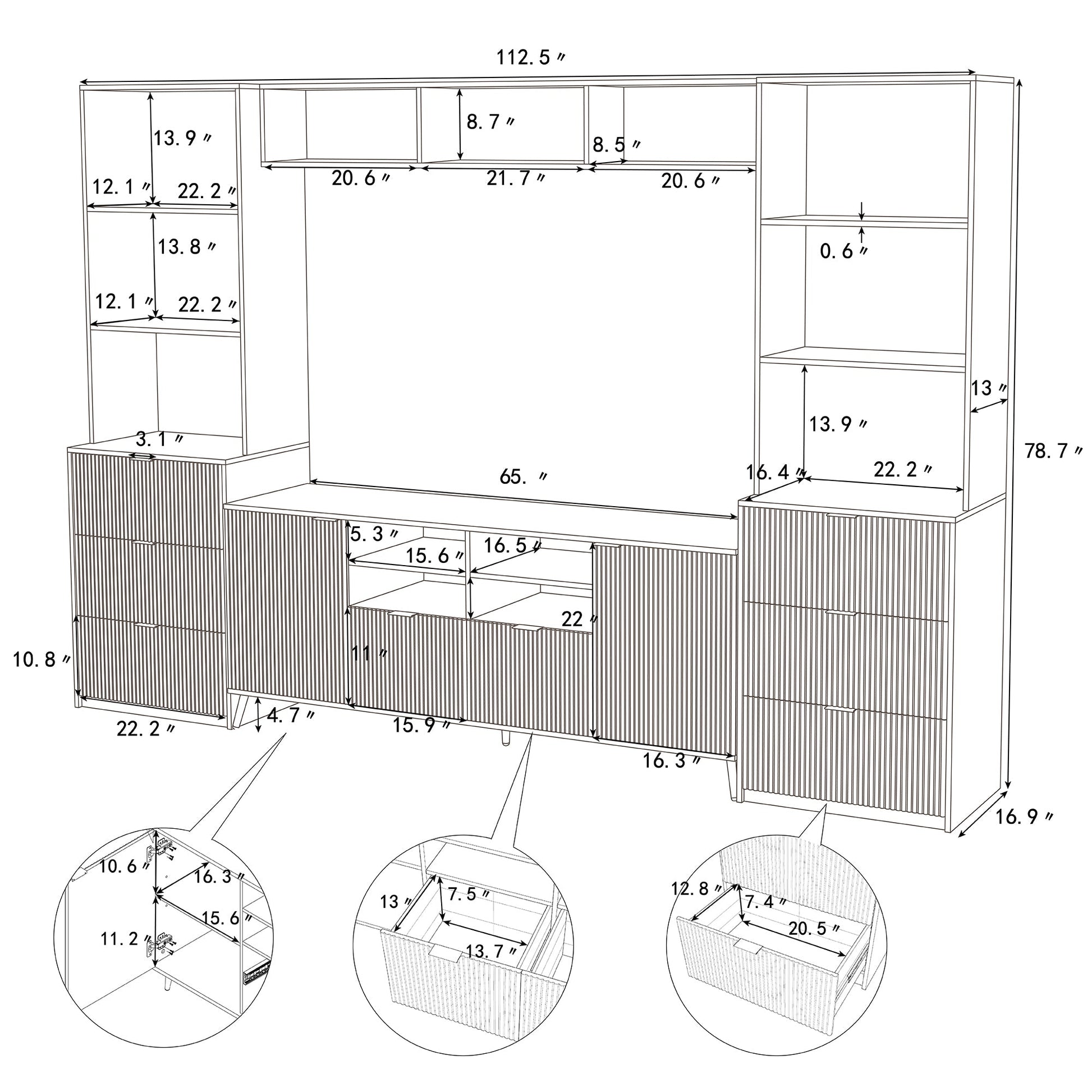 4-Piece Entertainment Wall Unit with 13 shelves,8 Drawers and 2 Cabinets, Multifunctional TV Stand Media Storage Cabinet with Fluted Line Surface for Living Room, for TVs Up to 70"