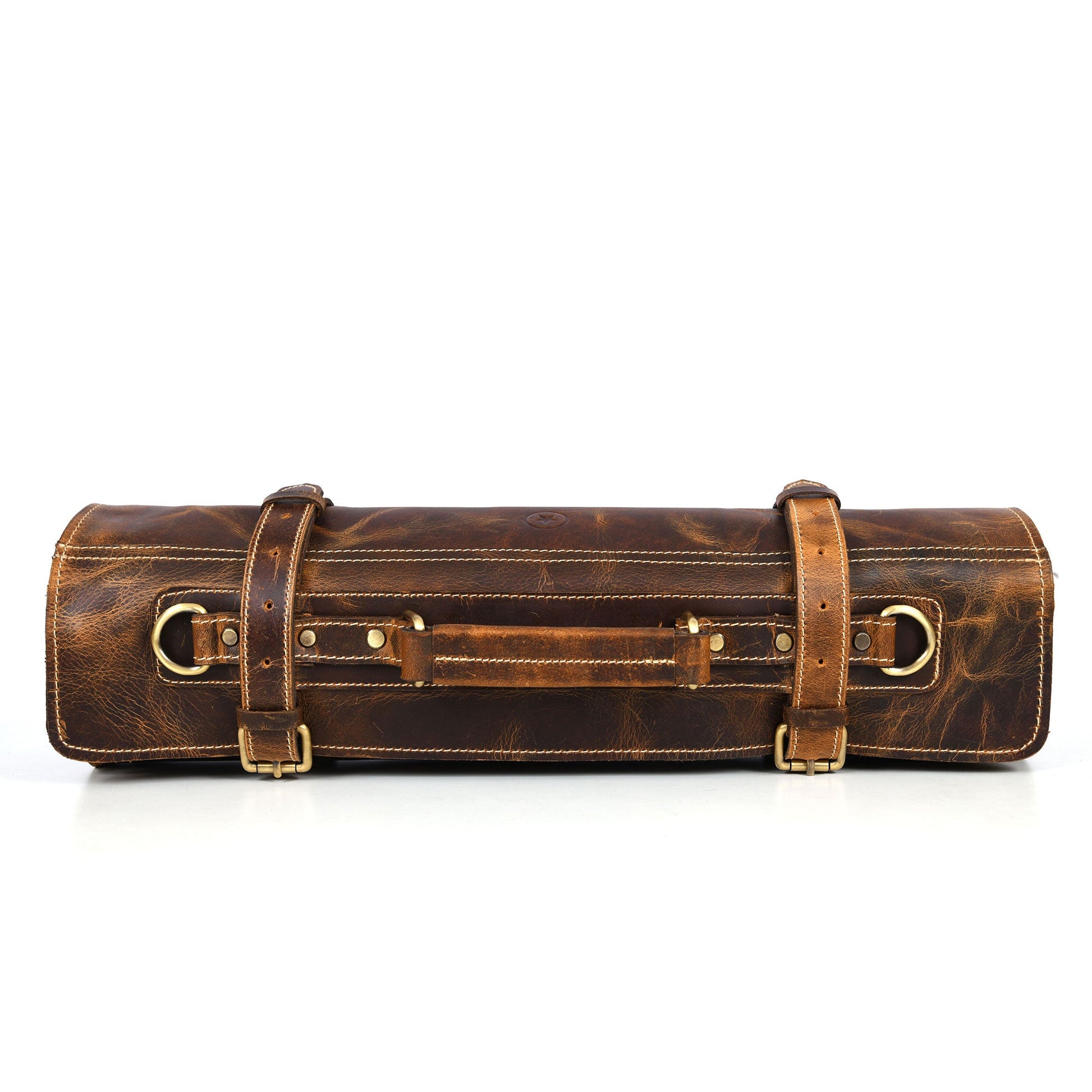 Aaron Leather Goods Tuscania Knife Roll Storage Bag Case, Caramel Brown Leather
