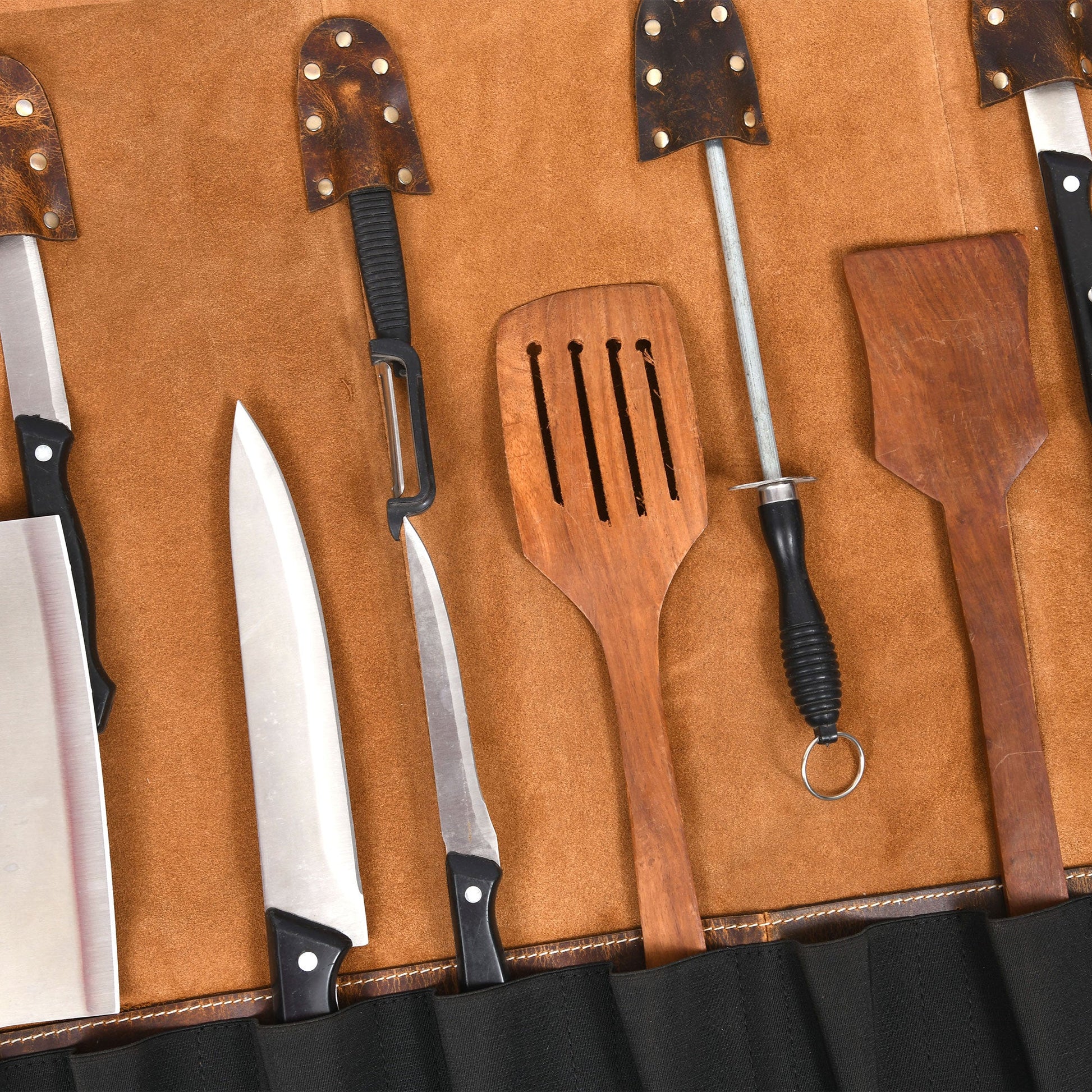 This 10-pocket leather knife roll gives you the space you need to store your knives, kitchen tools, and gadgets, rolling up into compact and secure storage. Store about 13 knives up to 18 inches in length in the elastic pockets and house smaller accessories in the 4 bonus utility slots. The side zipper compartment and double-snap pouch provide added security for parts, accessories, or special items, ensuring they stay intact.