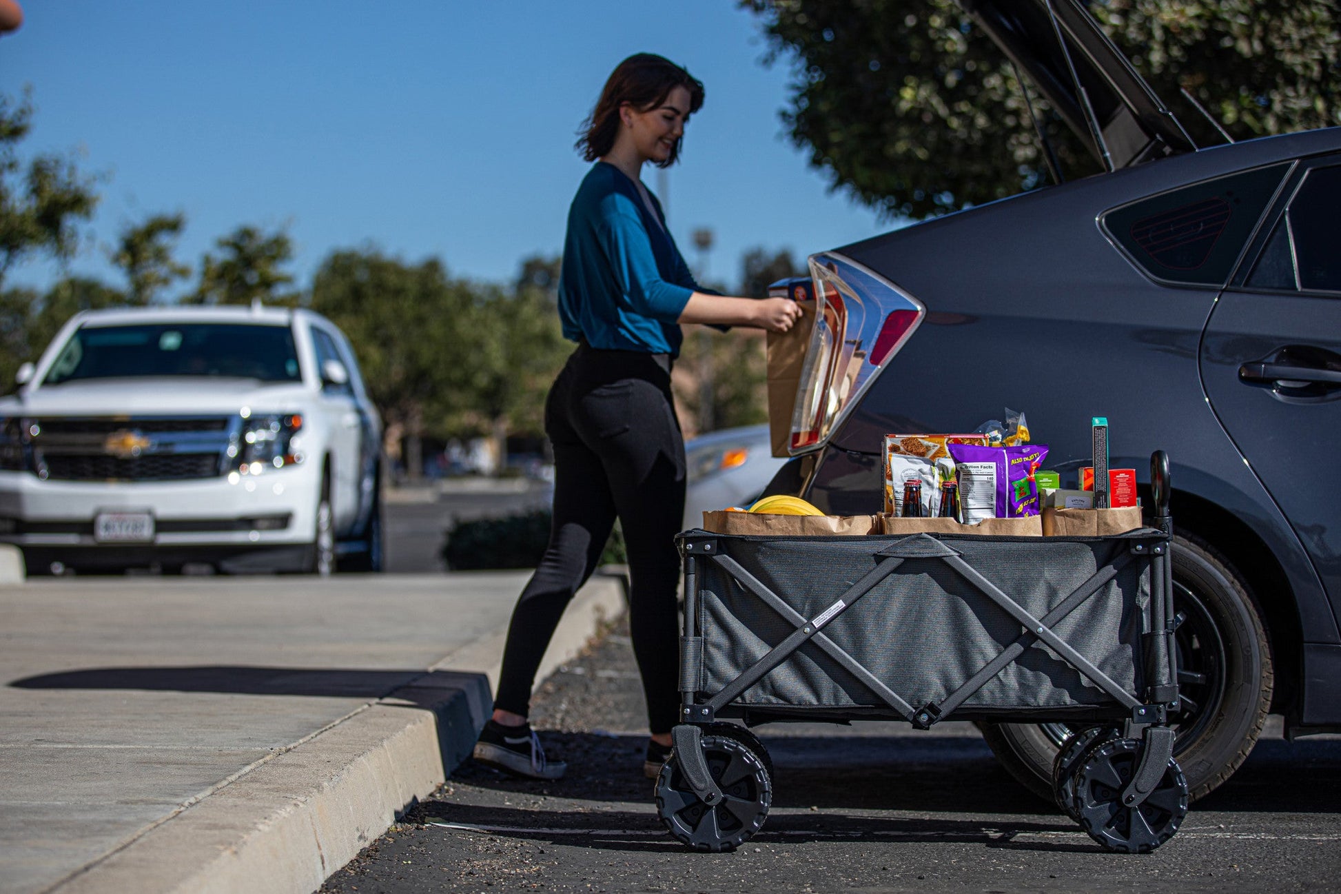 Save your back with the Adventure Wagon All-Terrain Portable Utility Wagon, a sturdy collapsible utility wagon with a rugged 225 weight capacity. With a powder-coated steel frame and durable two-tone polyester canvas for hauling everything you need, this all terrain folding collapsible wagon can take you everywhere from beach picnics to camping to shopping for groceries at your local farmer’s market. With extra large wheels, you can set up your picnic anywhere at all. This folding wagon packs away compactly, sets up easily, and has a telescoping handle for ease of use. A zippered, hanging storage pocket inside the cart is perfect for your phone and other delicate items. Is there anywhere this sport utility wagon can’t go?! Well, we can't think of anywhere!