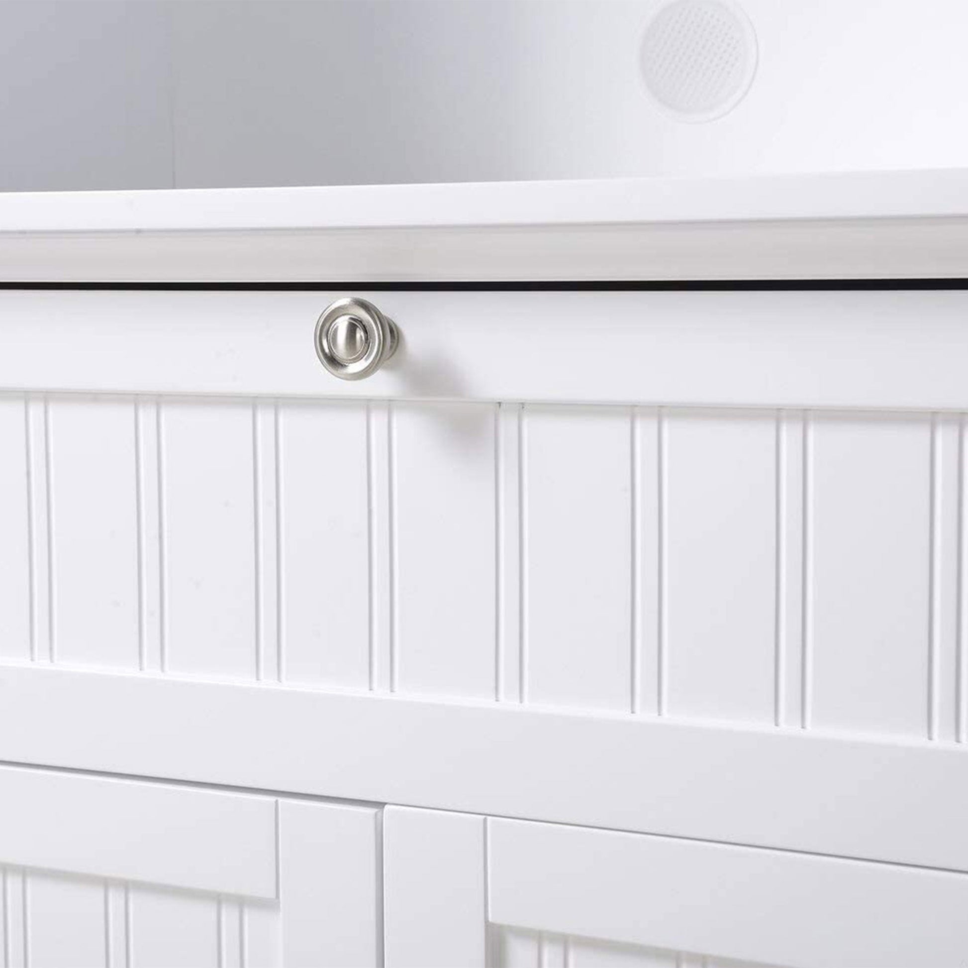 The top of this storage stand features an open compartment that measures 29 inches wide and 12.25 inches deep to fit a small standard microwave or other large appliances that take up too much space on counters or kitchen islands. Even more storage room is found in the top hutch with tempered glass doors and adjustable shelving, so you can show off china dishware, glasses, and other memorabilia.