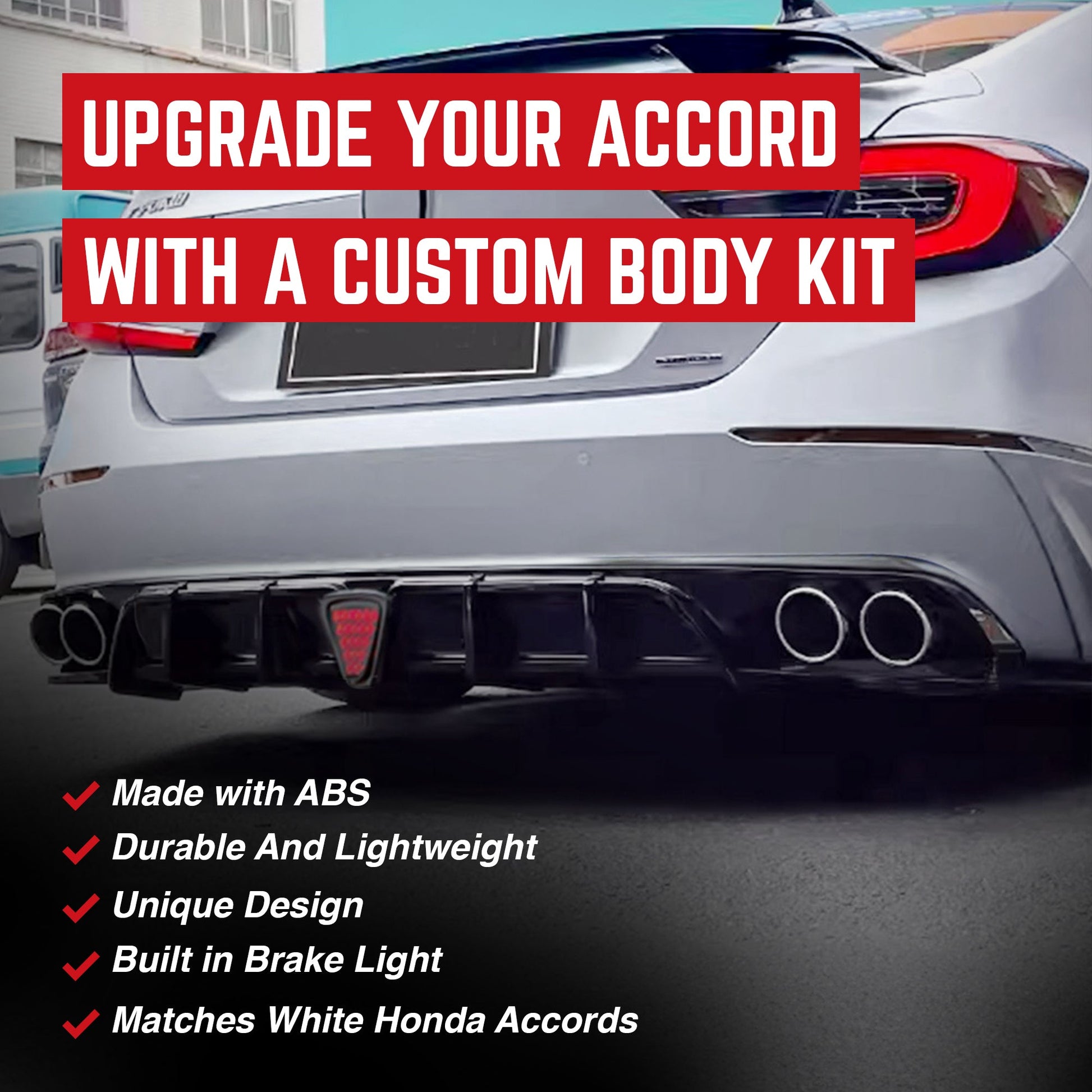 Enhance your vehicle's appearance instantly with a rear bumper diffuser lip, giving it a sportier and more assertive look. This accessory adds visual appeal and improves aerodynamics, boosting overall performance and providing protection against road bumps and scratches. Designed meticulously for the 2018-2023 Honda Accords, it seamlessly integrates for a precise fit. The package includes 1 expert rear bumper diffuser lip with an LED light kit that perfectly complements the vehicle's unique style. For a smooth installation, professional assistance is recommended to ensure a secure and durable fit, allowing Accord owners to confidently drive their upgraded and eye-catching vehicles with the expertise of skilled technicians.