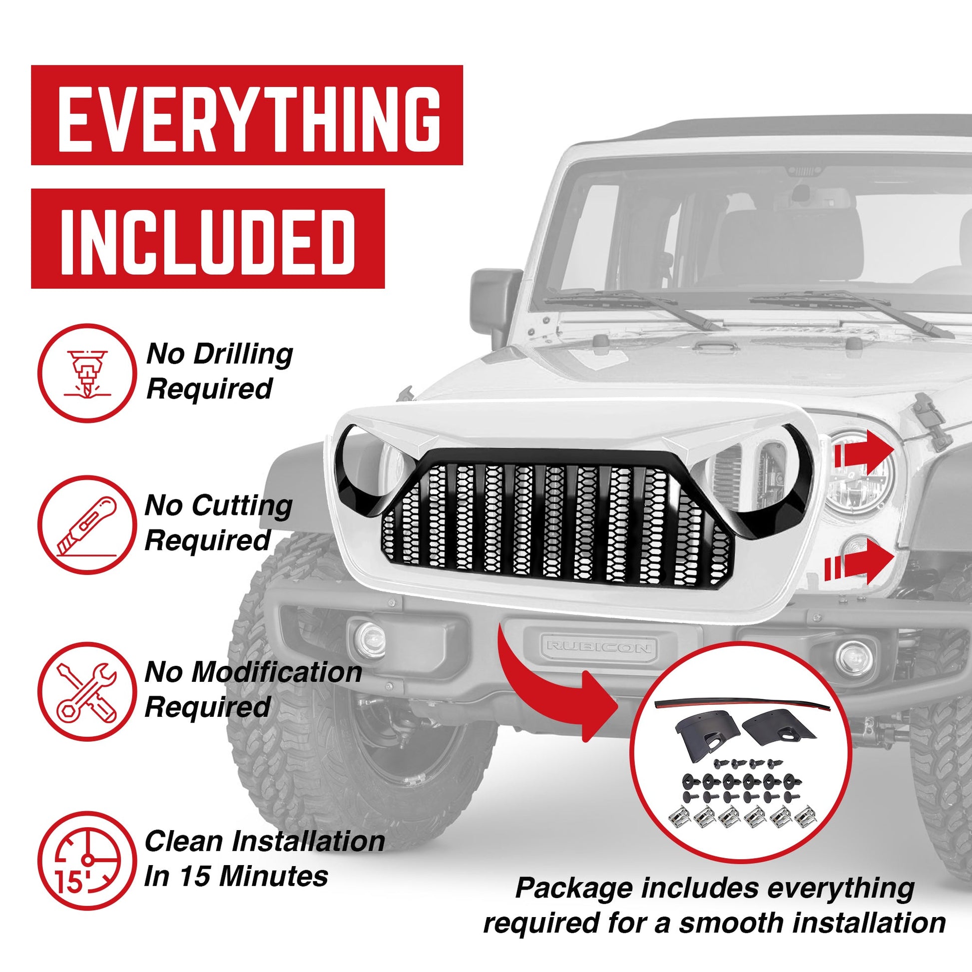 The grille fronting is compatible with 2018-2023 Jeep Wrangler JL and Gladiator JT Models without TrailCam; Not Compatible with models equipped with front-facing cameras.