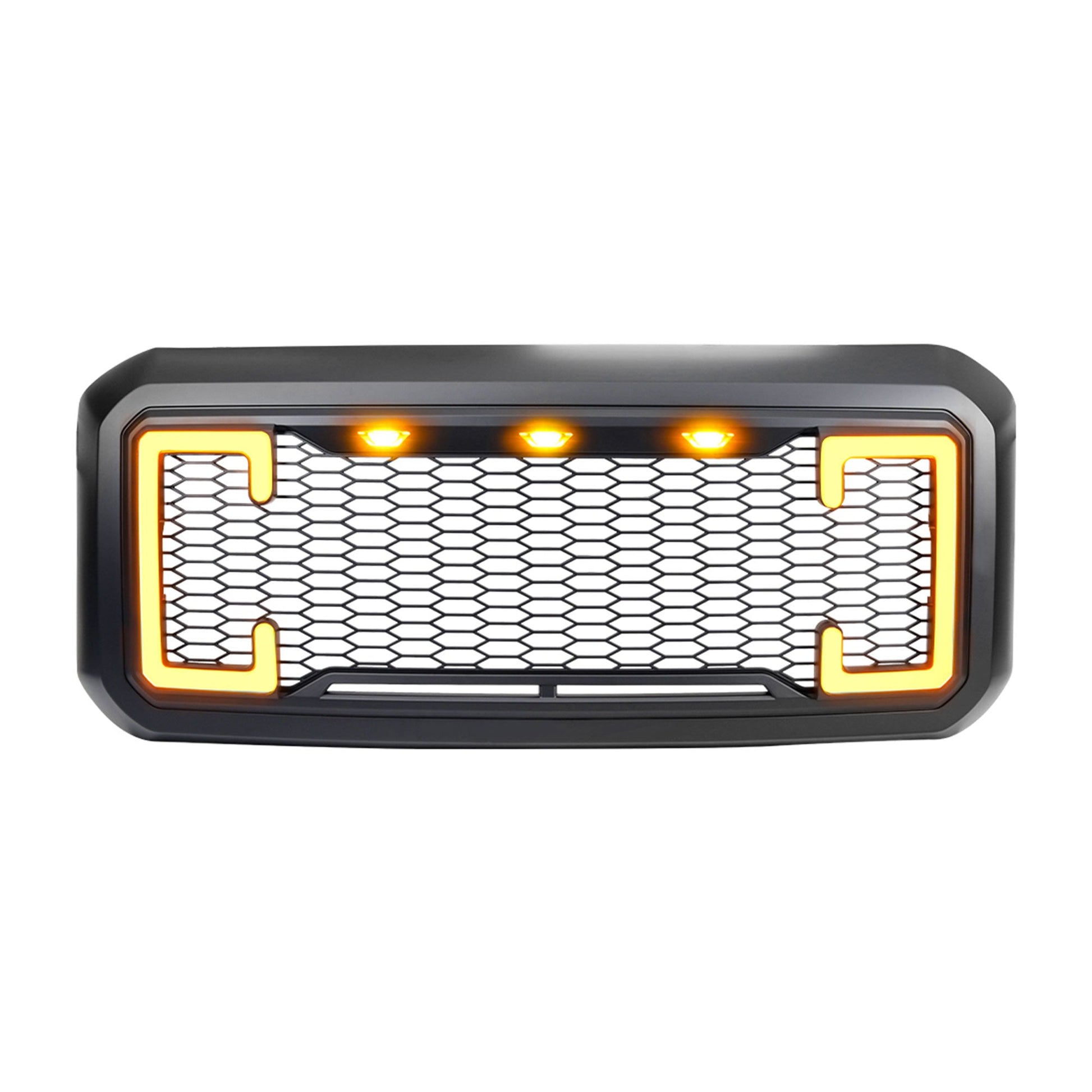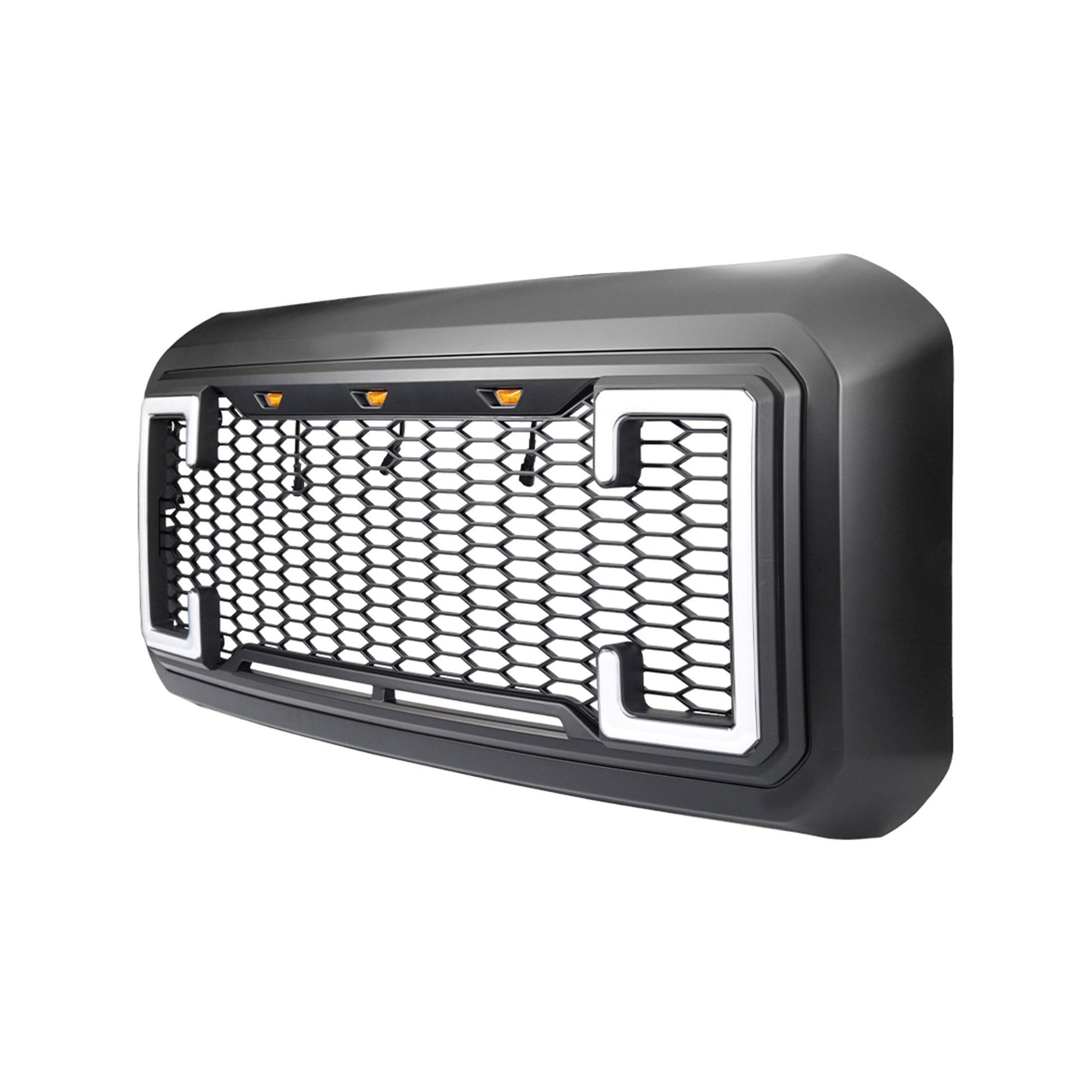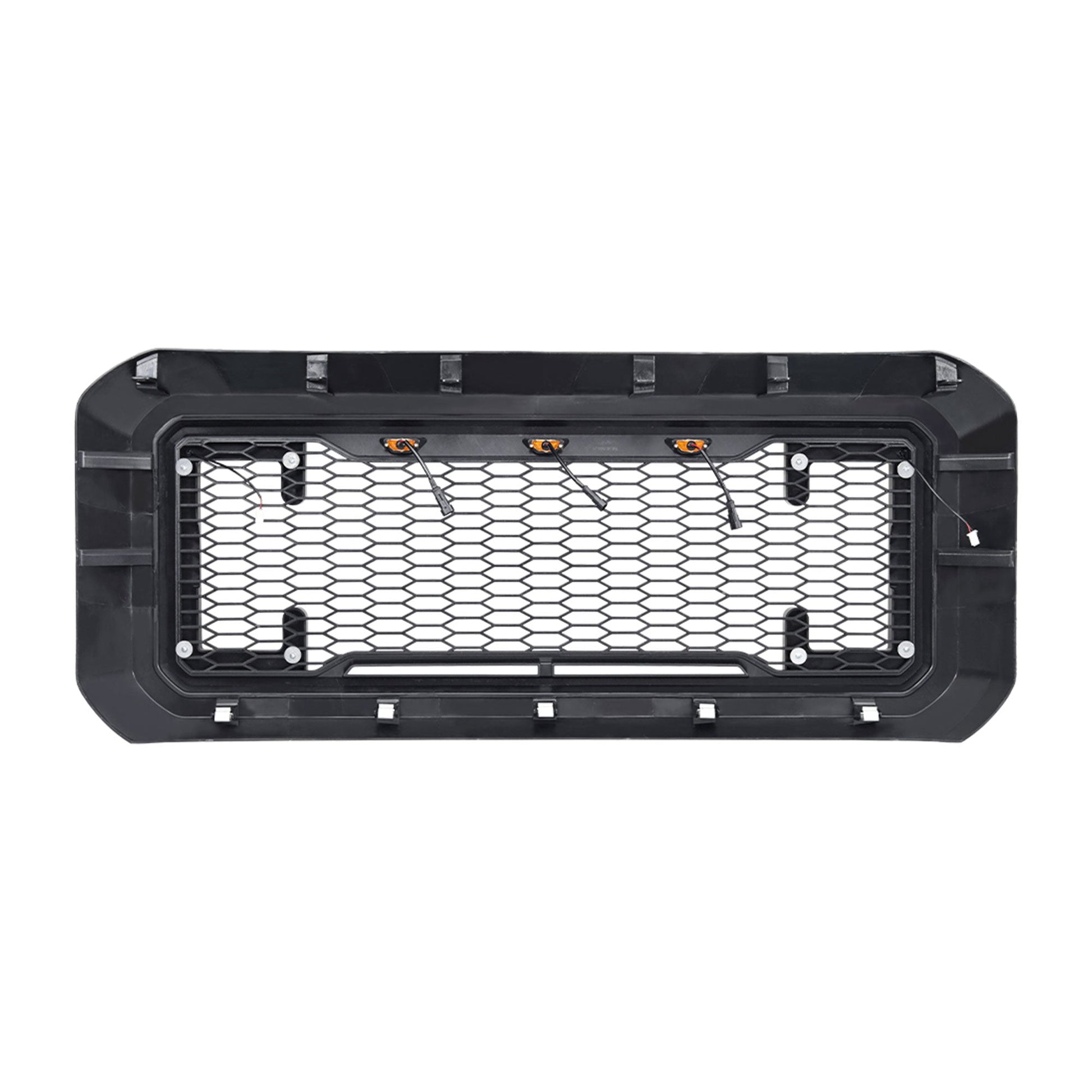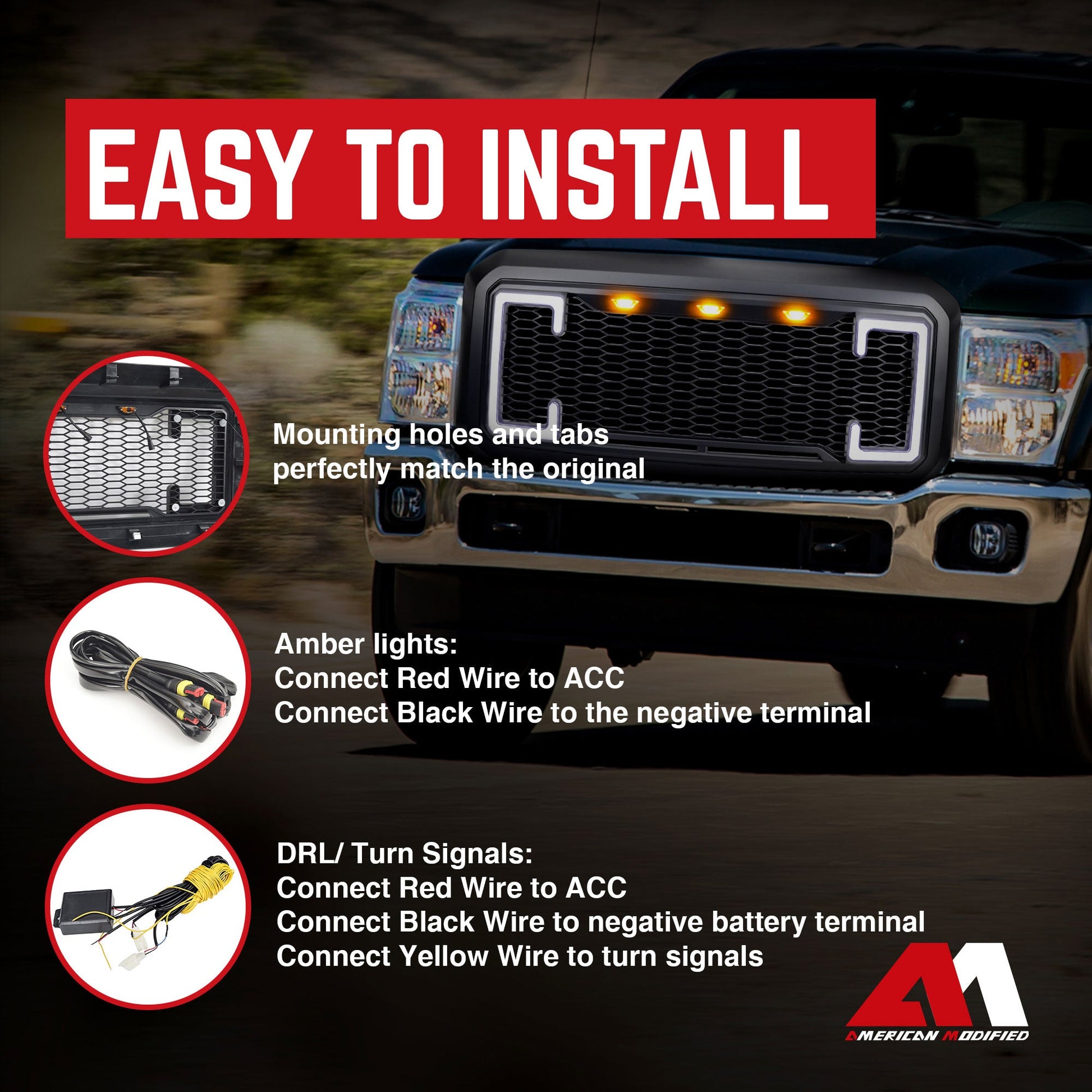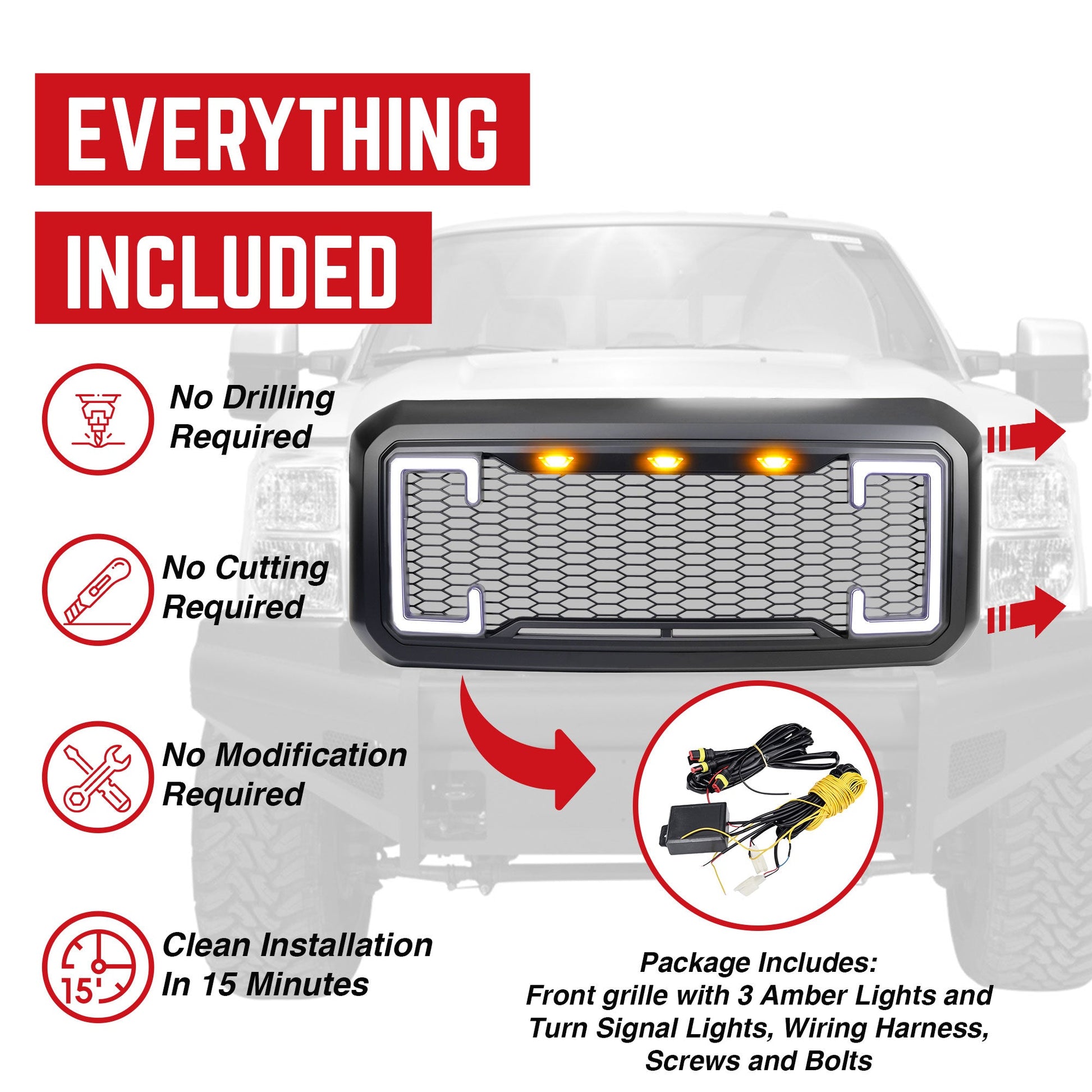 The grille includes 3 amber LED running lights, turn signal lights, and Daytime Running Lights (DRL), adding a distinct, eye-catching element to your truck while improving visibility during nighttime and adverse weather conditions. These LED accent lights come complete with a wiring harness that easily splits into your Ford's existing factory headlight harness, making installation straightforward.
