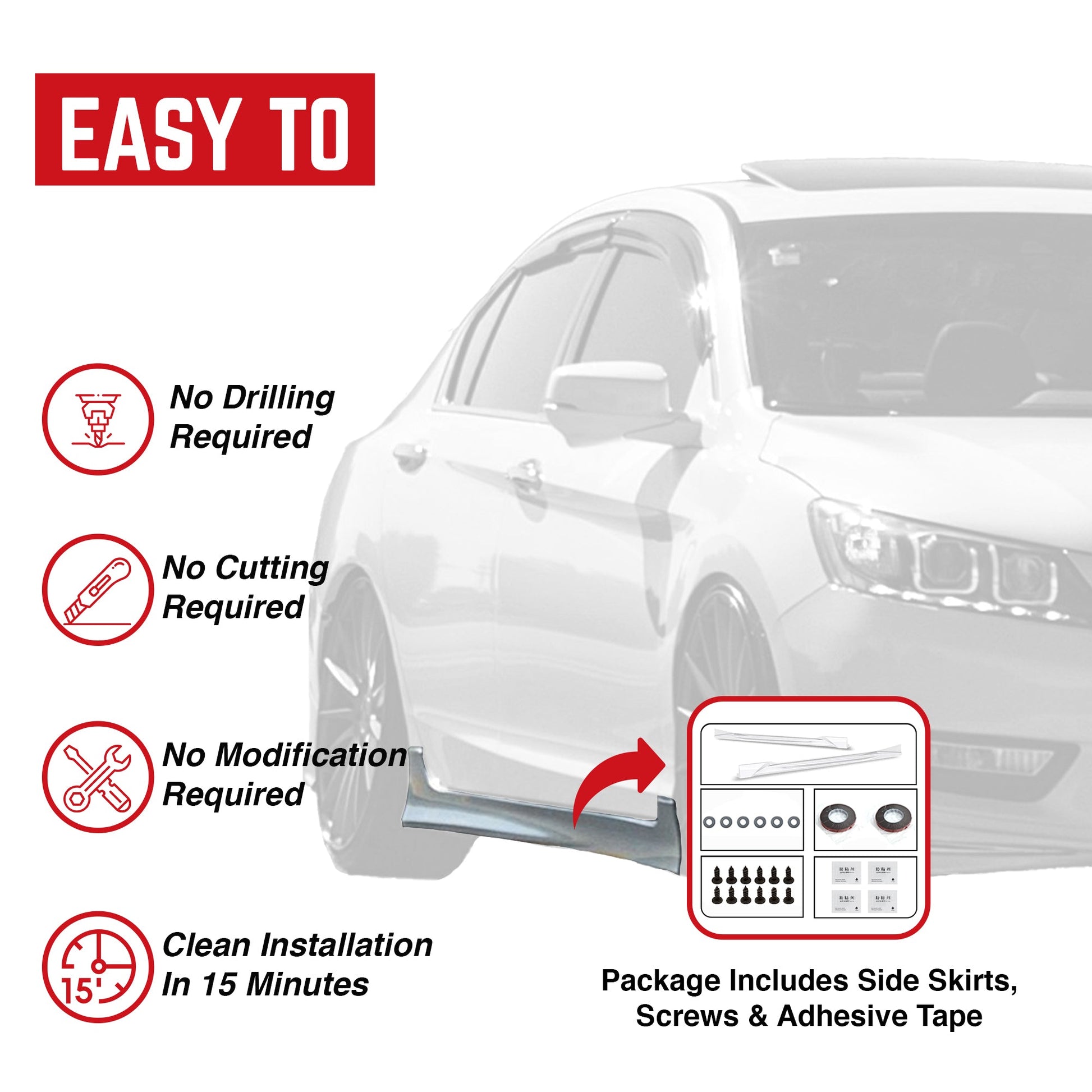 - Side skirts seamlessly integrate with 2018, 2019, 2020, 2021, 2022, and 2023 Honda Accord models, ensuring a precise fit that enhances the overall look of your vehicle
