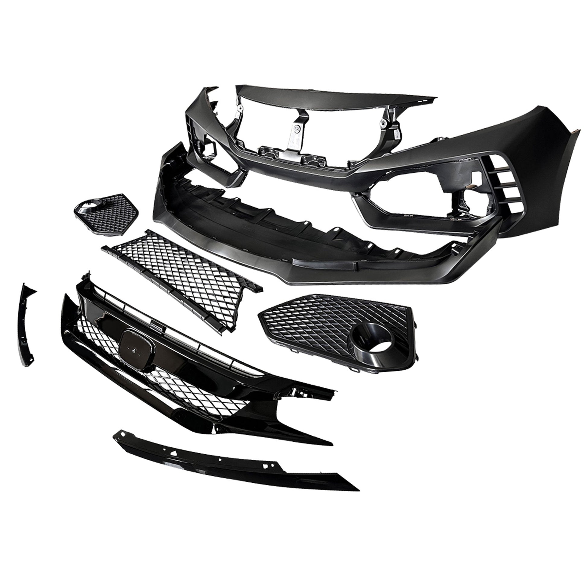 The AMERICAN MODIFIED Type R Style Conversion Front Bumper with Grille makes your vehicle stand out. Crafted from premium Polypropylene (PP), this comprehensive kit is designed to elevate the aesthetics and functionality of your vehicle. Including a lip, upper grille, eyelids, and lower grilles, this exclusive package offers a complete transformation for your ride.