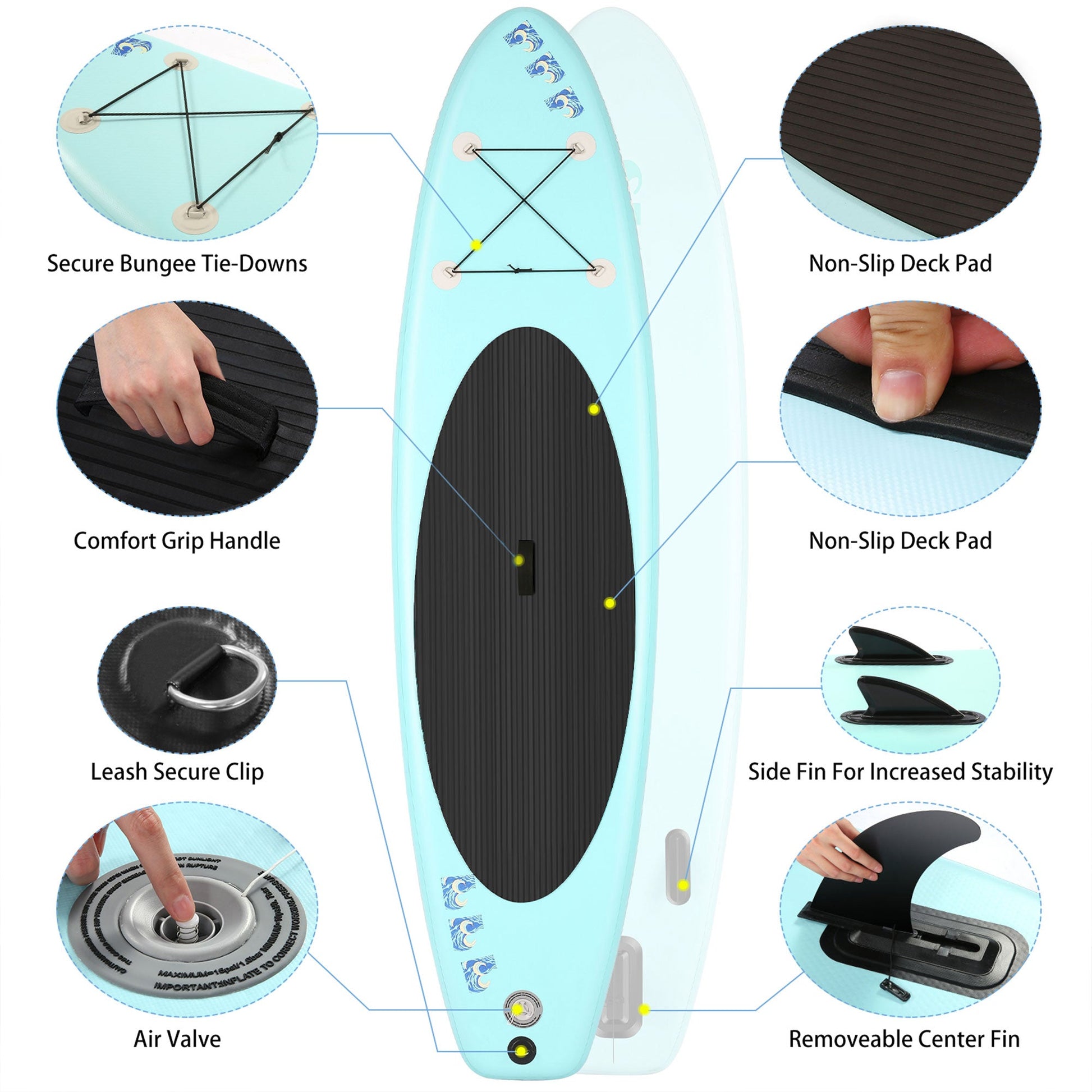 - Includes adjustable SUP paddle, coiled ankle cuff with safety leash, manual double action pump, removable center fin, carry bag, and repair kit