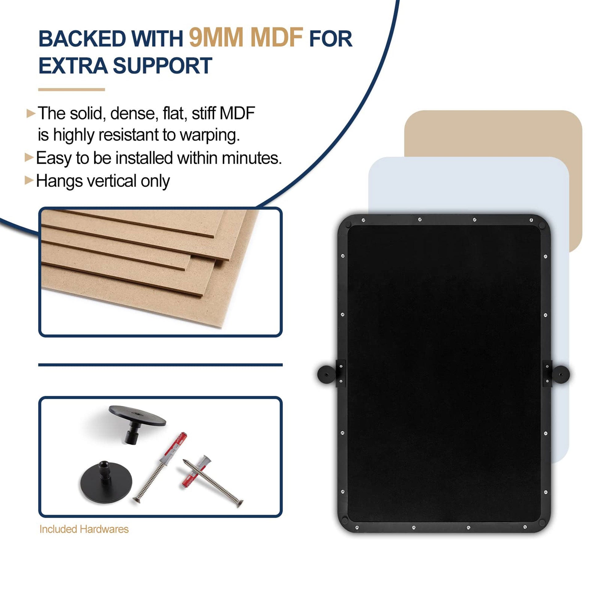 - Premium construction features high-quality stainless steel, no-distortion 4MM HD floating glass, 9mm MDF backboard, and sturdy wall brackets