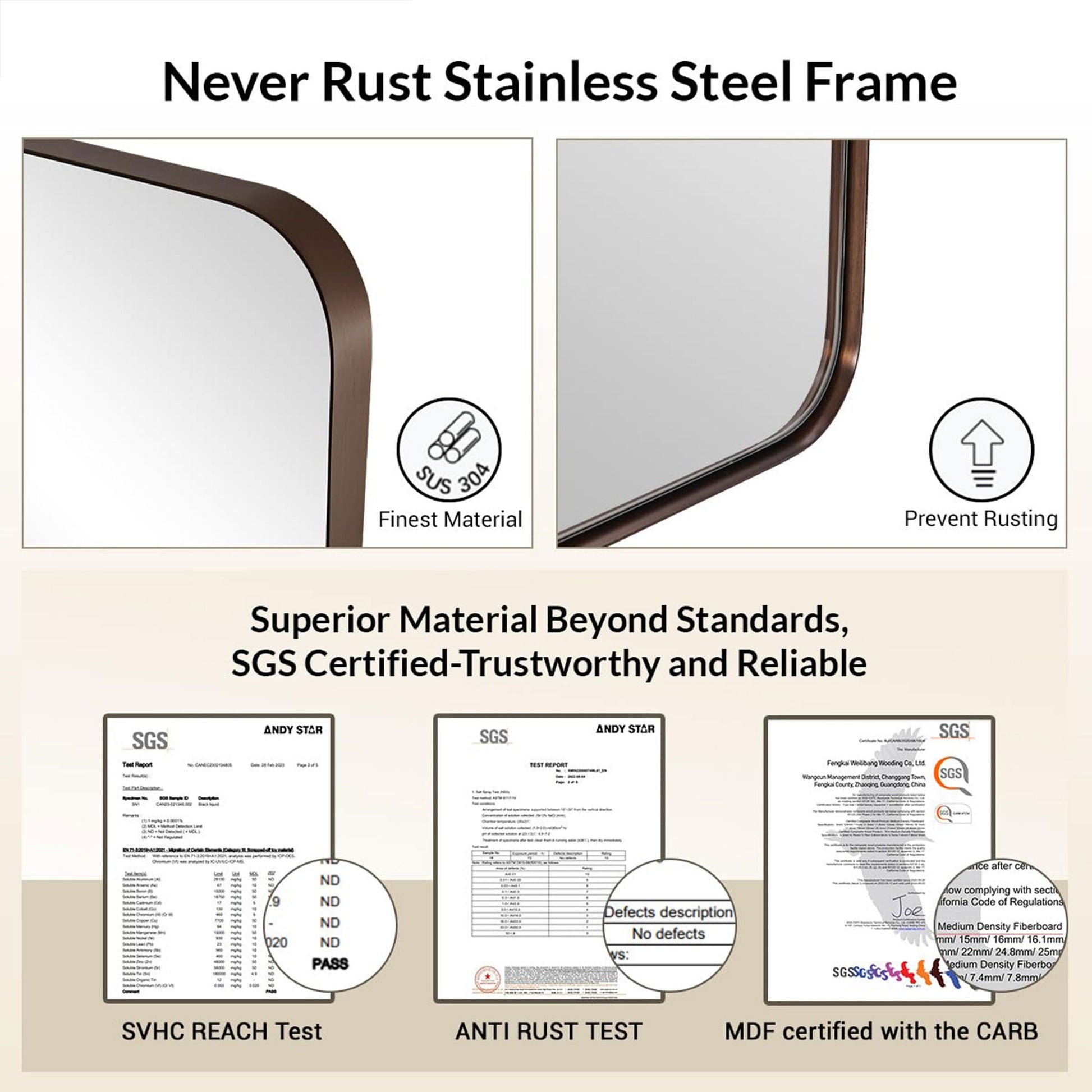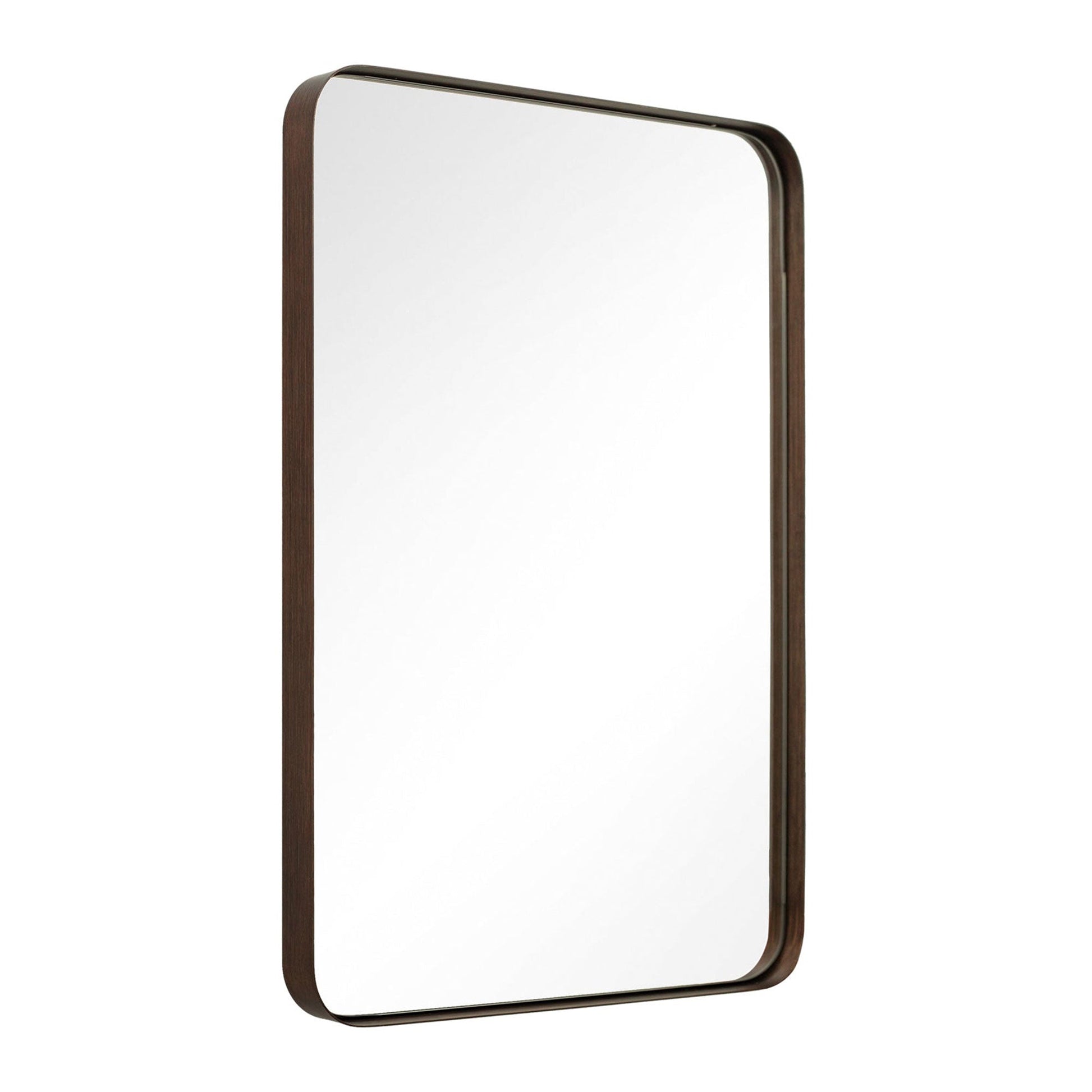 This rectangular mirror is sure to bring a sophisticated accent to any living area. Quality is in the details, from a refined bronze finish, precise linework, and the gap between the frame and glass. This mirror presents beautifully under high-definition floating glass and medium-density fiberboard with no visual distortion. A broad rectangular shape with rounded corners offers increased vertical visibility so you can get an unobscured look at your reflection before the day begins. The heavy-duty, 2-millimeter stainless steel frame with multiple layers of waterproofing allows for a luxury appearance boasting long-lasting durability. This modern hanging mirror is rated for use in the bathroom, fireplace, entryway, living room, and other high-moisture areas.