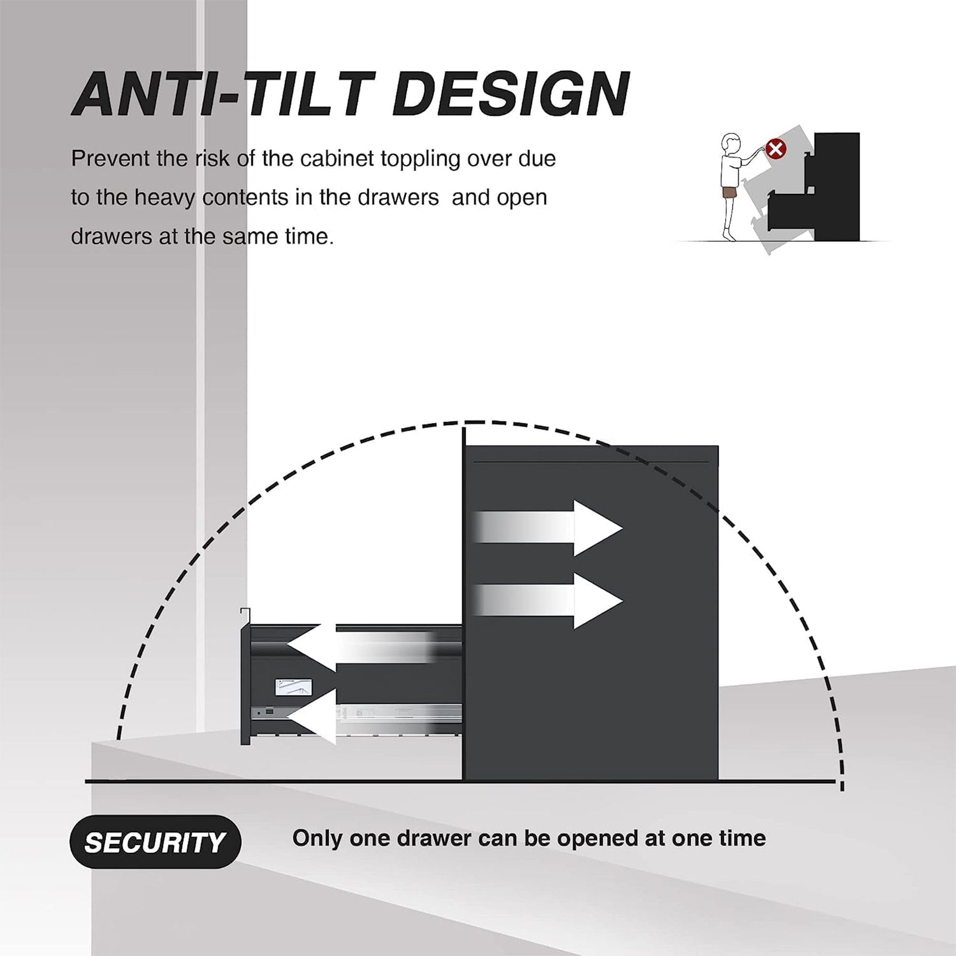 Designed with full extension and steel ball-bearing suspension, the drawers can be opened and closed quietly and easily. When a single drawer is open, the interlocking system prevents the other drawers from opening, which prevents tipping and harmful accidents. The file cabinet is made of heavy-duty steel, and the surface is powder-coated, making it smooth and resistant to scratching. This file cabinet comes with 1 lock that can simultaneously secure all 2 drawers, ensuring the safety of your belongings and privacy at any time. The plastic pad on the bottom of the cabinet protects your floors from scuffs while also reducing noise. Equipped with 2 spacious and deep hanging file drawers, each drawer has 1 adjustable hanging bar, allowing you to organize your paperwork to your specific liking.