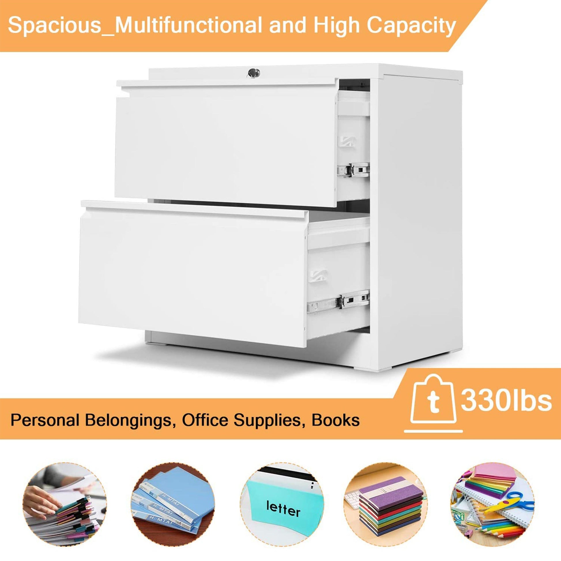 This 2 drawer filing cabinet features 2 adjustable hanging bars in each drawer to conveniently organize letter and legal-sized files and other important documents. Both drawers lock shut in a single turn to keep the contents secure. With a durable steel design, this white cabinet is a great storage option for garages, offices, or anywhere else you need secure storage in your home. An interlocking drawer design only lets 1 drawer be opened at a time to keep the cabinet from tipping over. This cabinet comes with detailed instructions, so you can easily assemble the device. 2 keys are also included, so you can still open the cabinet if 1 key is lost. This storage cabinet measures 28.25 inches long, 17.7 inches wide, and 28.3 inches tall to keep things safe in your home or office space.