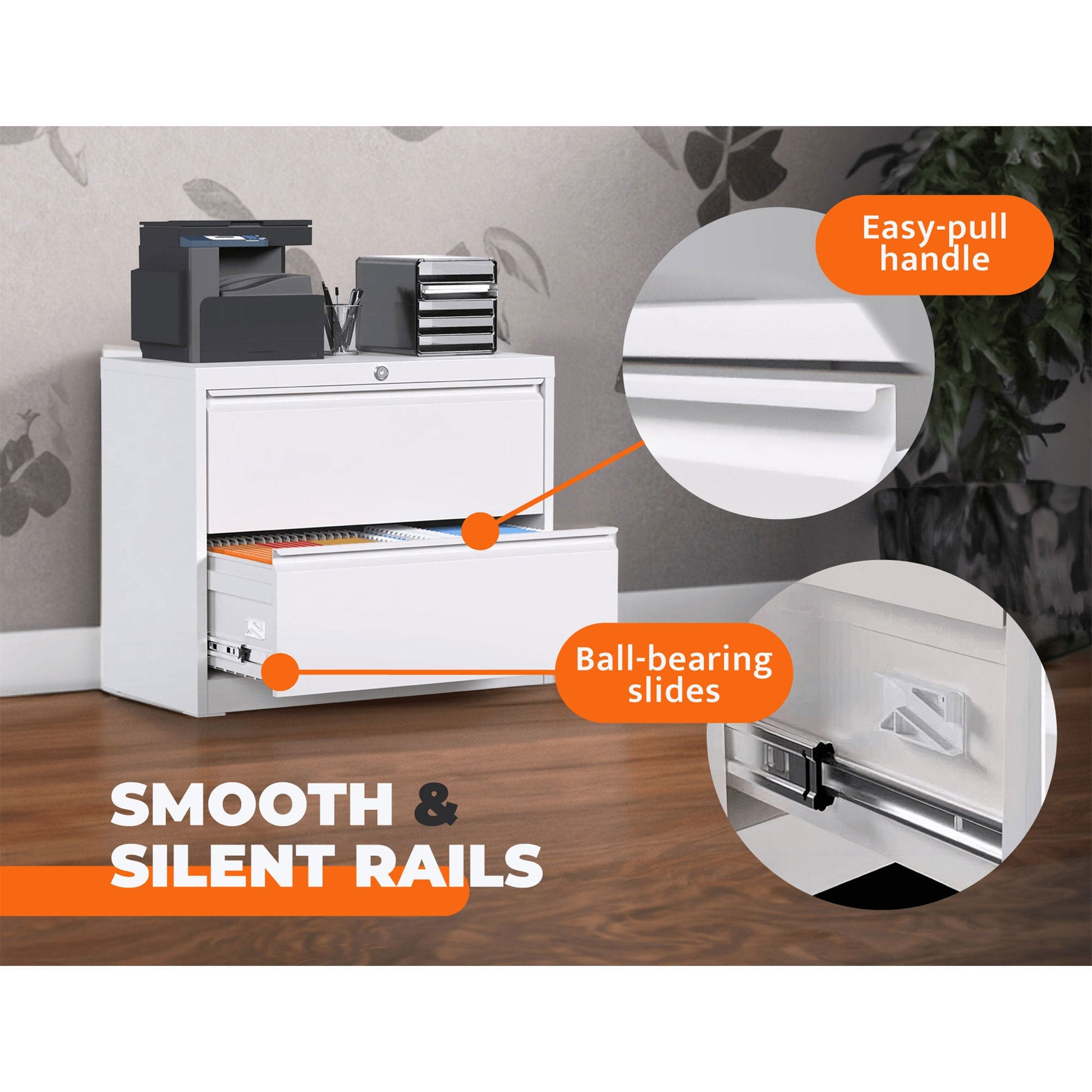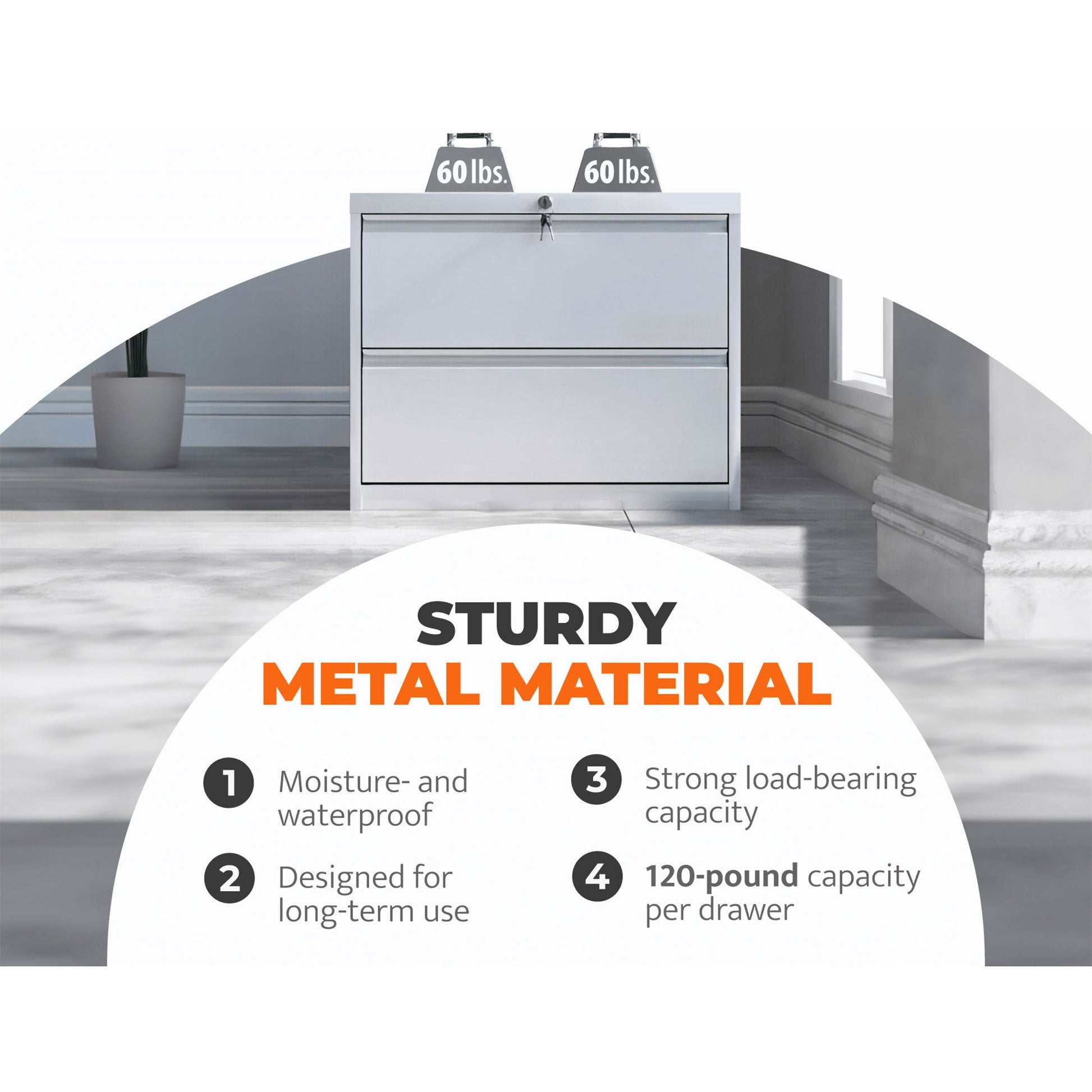 This 2 drawer filing cabinet features 2 adjustable hanging bars in each drawer to conveniently organize letter and legal-sized files and other important documents. Both drawers lock shut in a single turn to keep the contents secure. With a durable steel design, this white cabinet is a great storage option for garages, offices, or anywhere else you need secure storage in your home. An interlocking drawer design only lets 1 drawer be opened at a time to keep the cabinet from tipping over. This cabinet comes with detailed instructions, so you can easily assemble the device. 2 keys are also included, so you can still open the cabinet if 1 key is lost. This storage cabinet measures 35.43 inches long, 18.11 inches wide, and 28.34 inches tall to keep things safe in your home or office space.