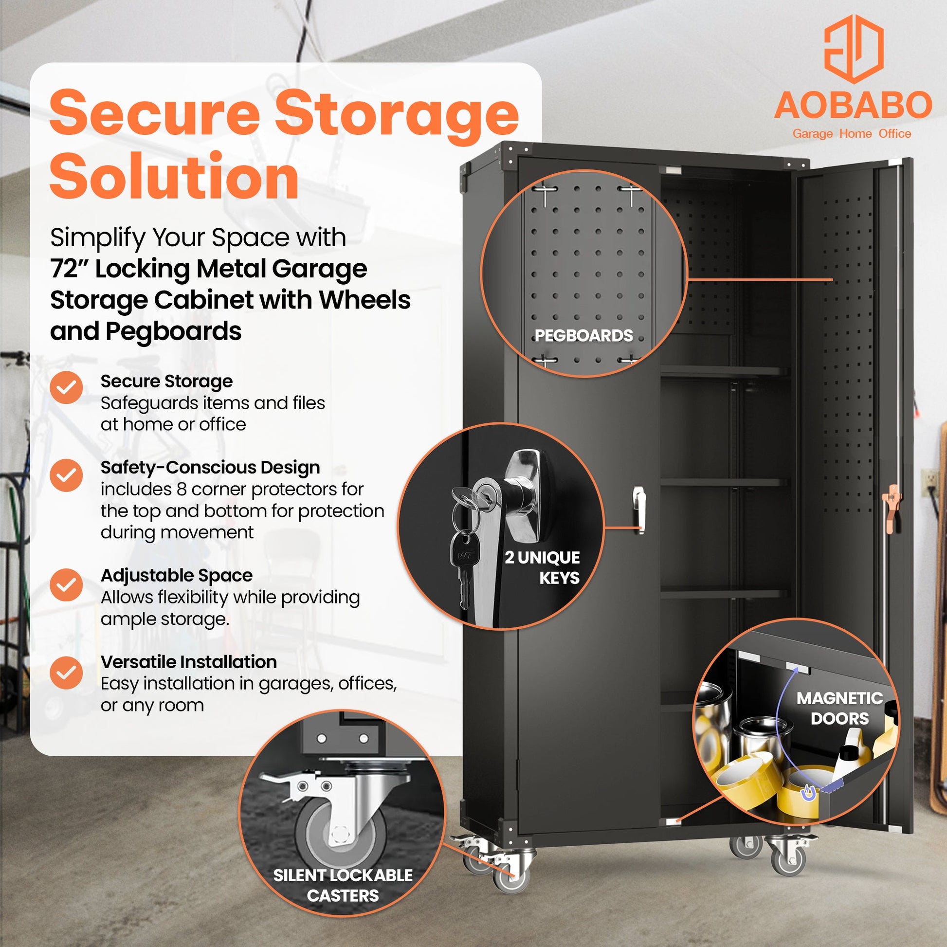 AOBABO 72 Inch Locking Metal Garage Storage Cabinet w/ Wheels & Pegboards, Black