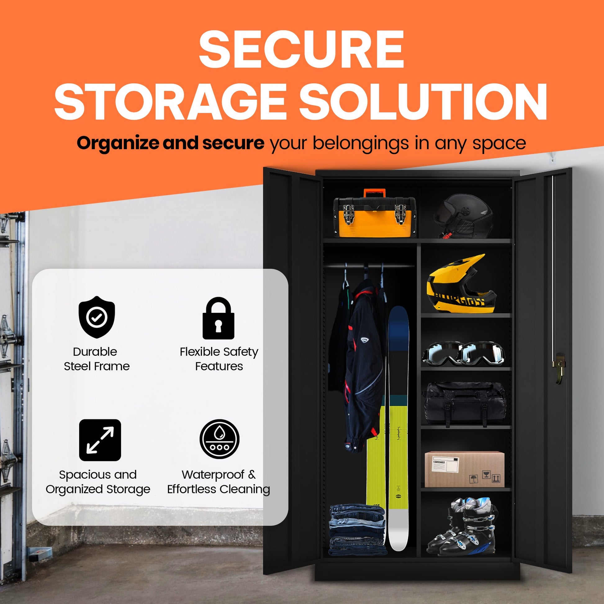 This 72-inch steel wardrobe-style cabinet offers 3 adjustable shelves, providing ample space for organizing clothes, towels, bedding, office supplies, books, small parts, and more. Crafted with a whole-in-one reinforced steel frame construction, this closet organizer ensures durability and longevity. The modern matte black-coated finish makes the surface waterproof, and resistant to rust and scratches, ensuring an effortless cleaning experience for years to come.