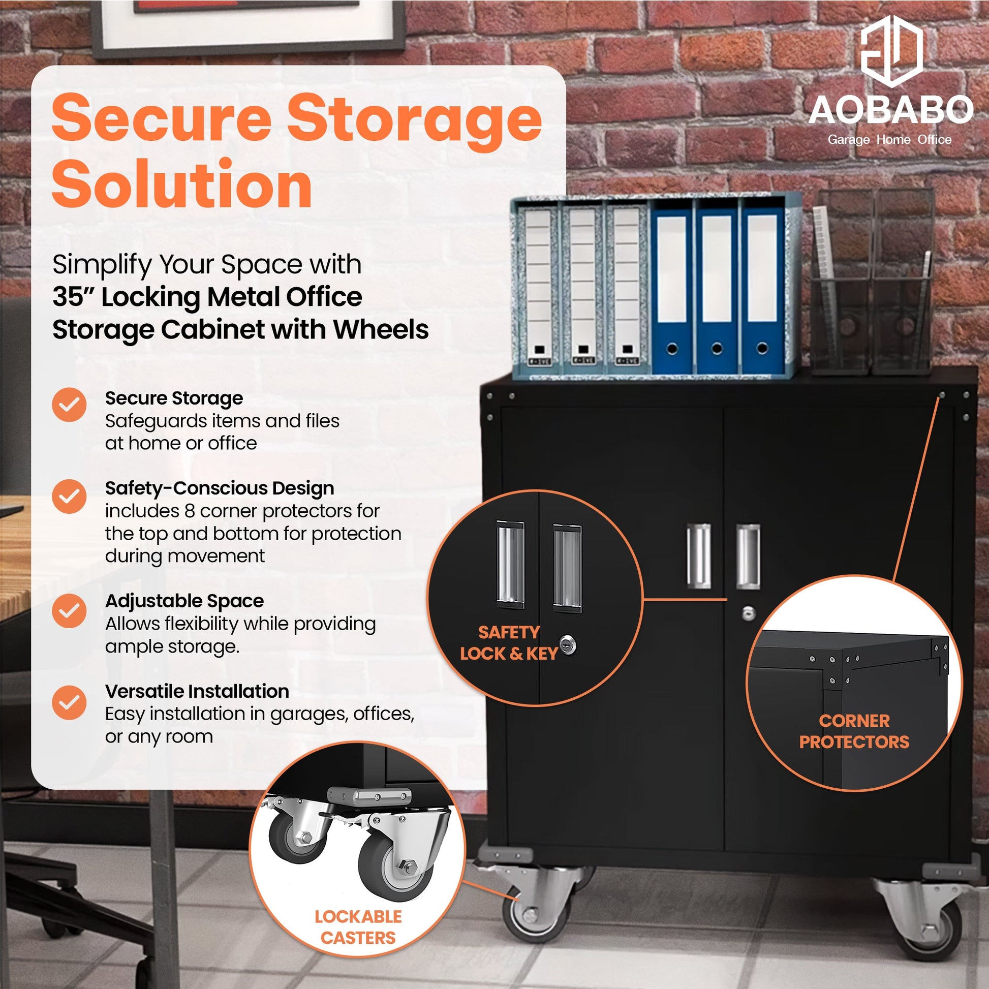 AOBABO Steel Lockable Office Storage Cabinet, Adjustable Shelves & Wheels, Black
