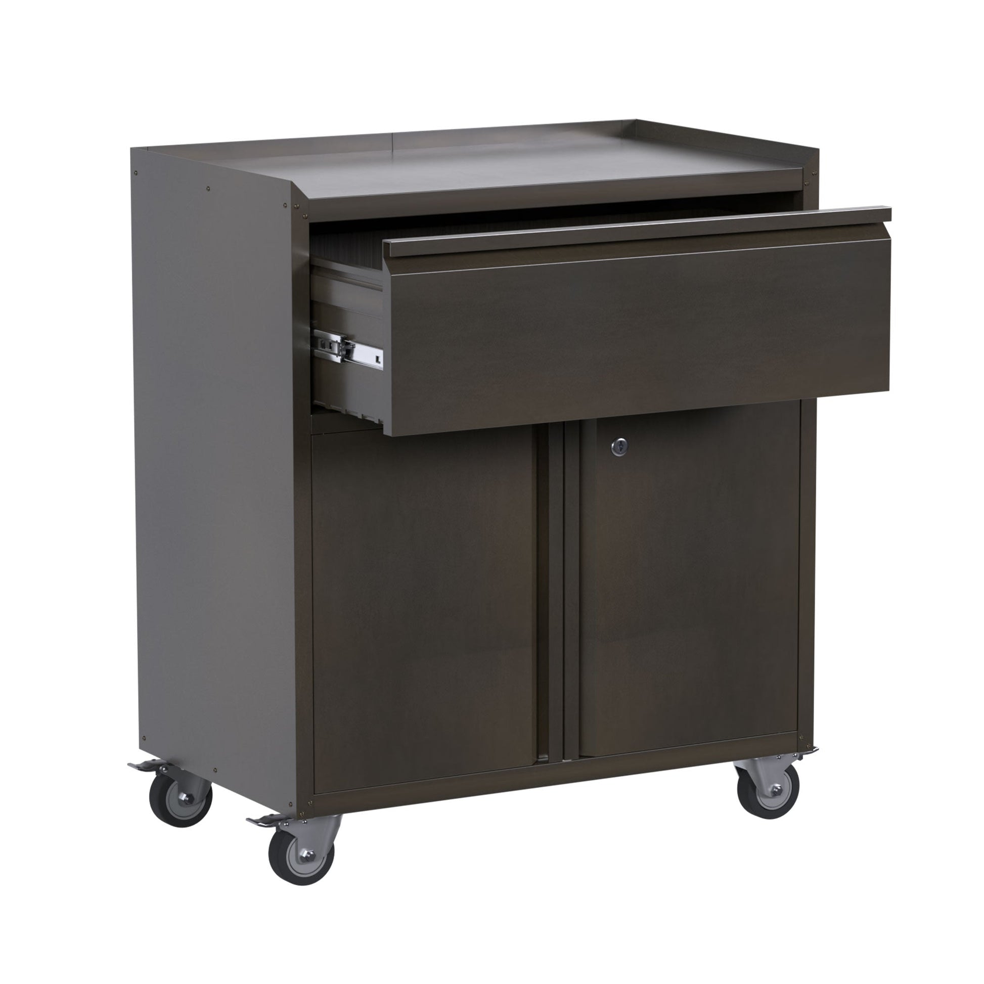 Get ready to experience the convenience and reliability of a well-organized space with the AOBABO Steel Lockable Wheeled Storage Cabinet with a Drawer and 2 Shelves that effortlessly combines style and function, making it a must-have addition to any home or office setup.