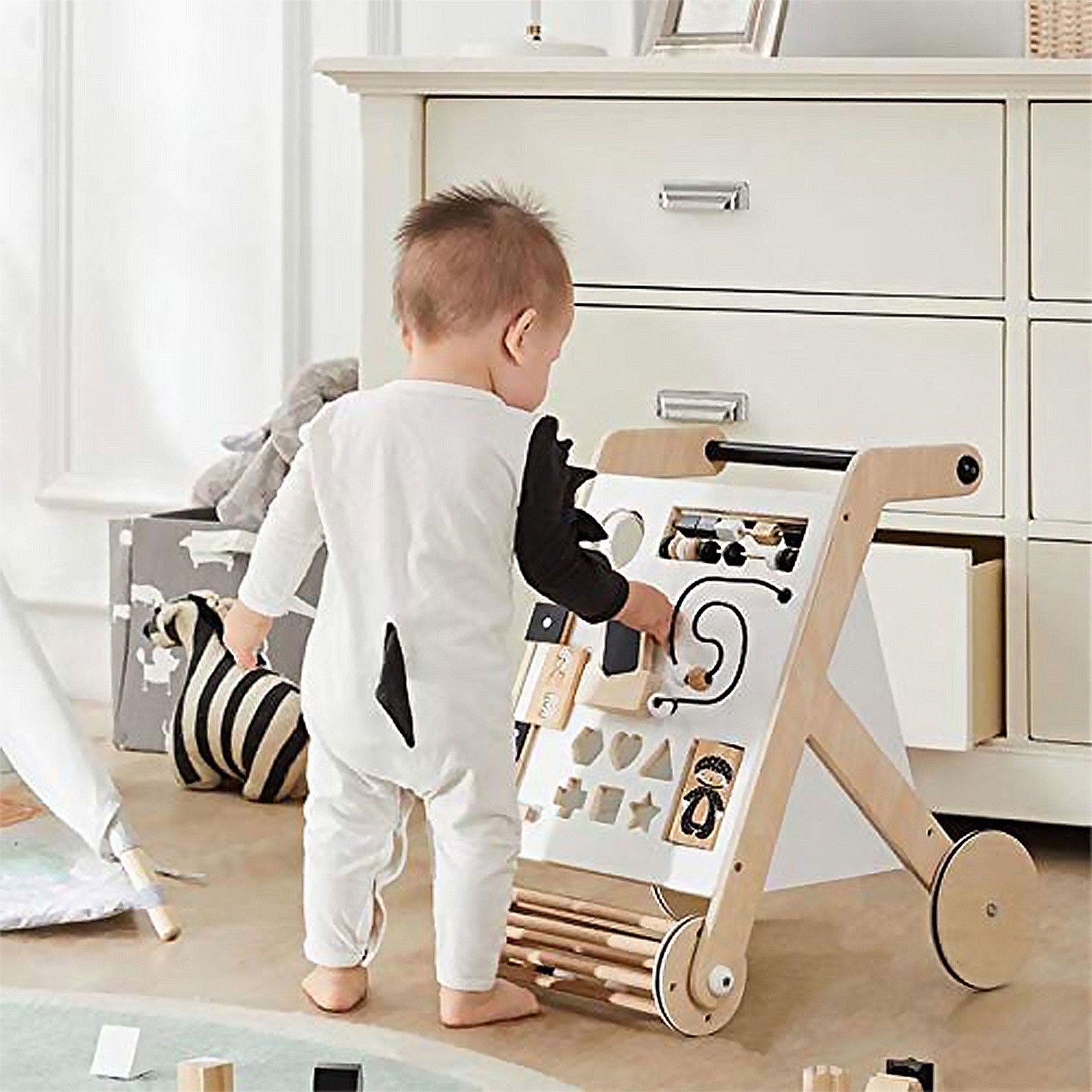 Your baby can practice standing and walking with this interactive walker. This push and pull device includes 6 shapes, a cell phone and holder, 5 counting flaps, a mirror, a bead maze, and an abacus that will have your baby involved for hours. The attractive painted wood and plastic are safe for the whole family and adds to the style of any room that it is in.