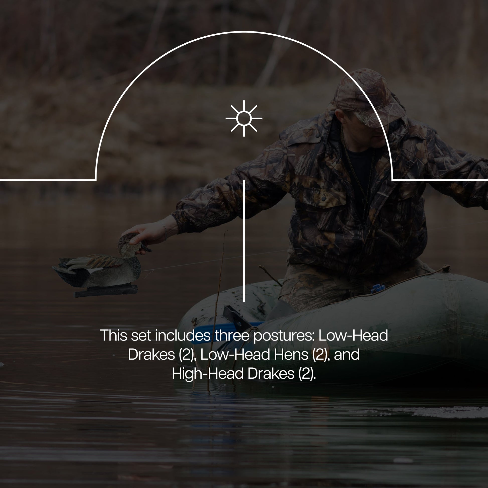 - This set includes three unique postures to enhance the realism of your decoy spread, Low-Head Drakes (2), Low-Head Hens (2), and High-Head Drakes (2)