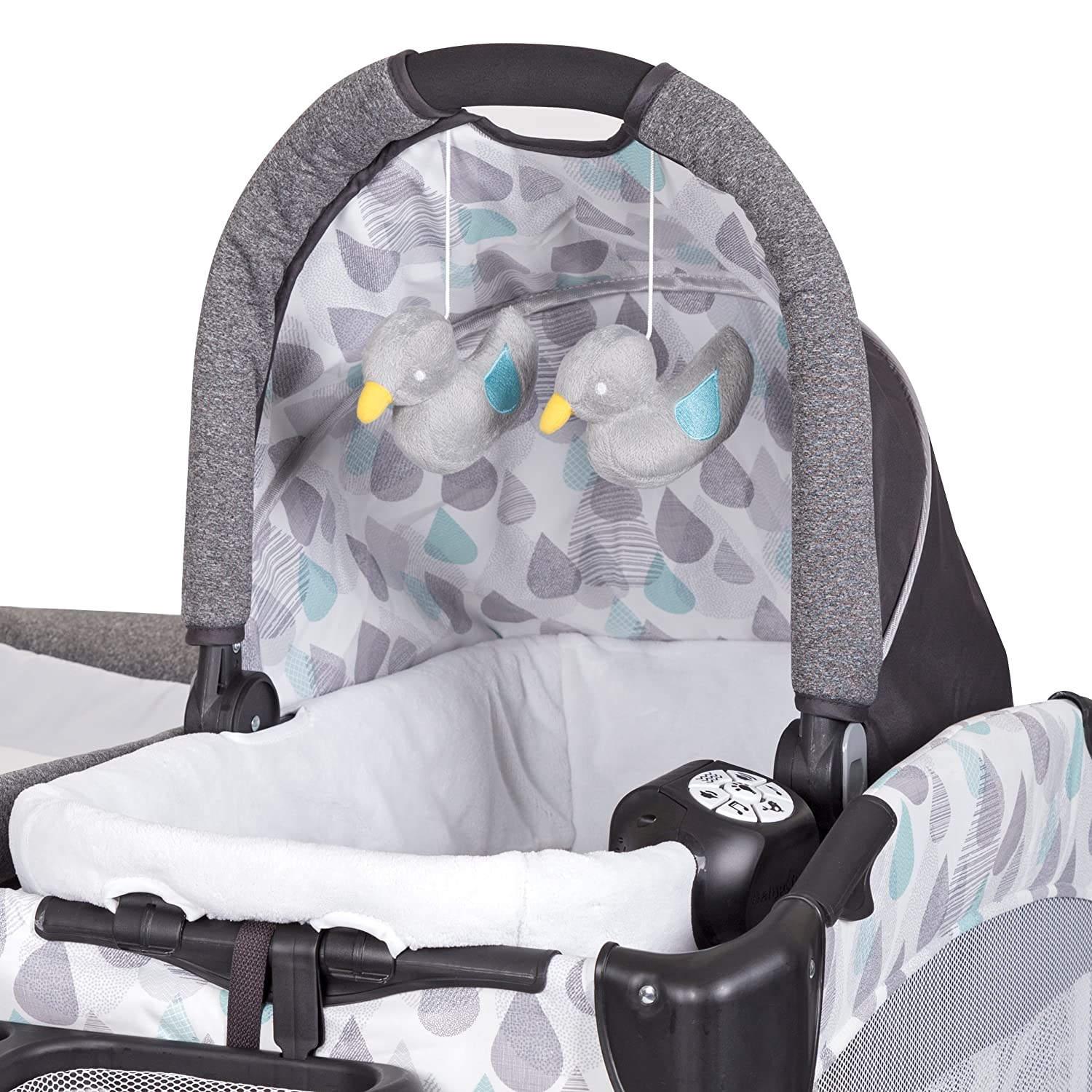 - Play yard features music center with nightlight and vibration to soothe your little one
