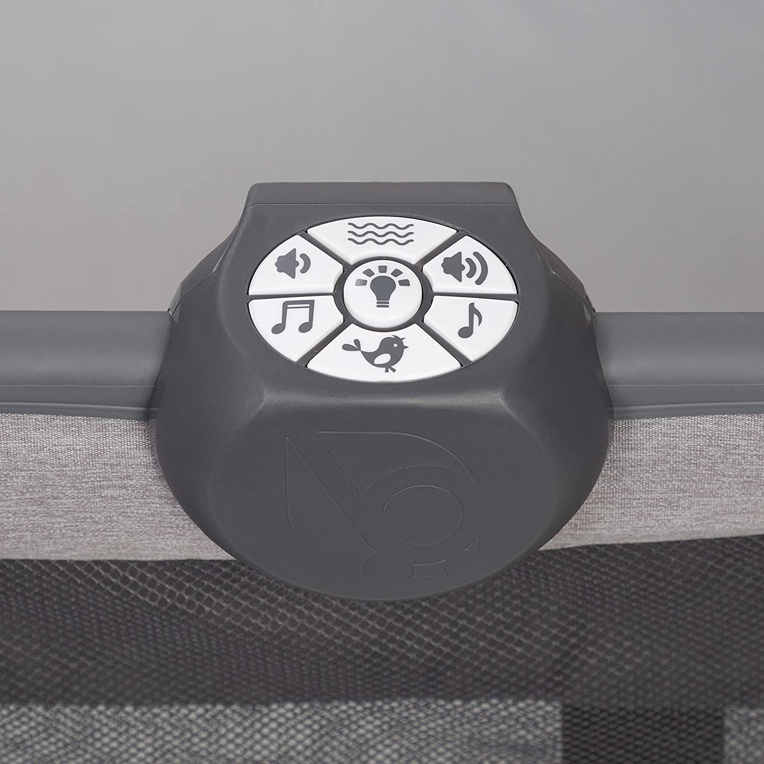 - Nursery center with plush fabric lining includes electronic music center with volume control, a nightlight, and vibration with 2 styles of music and nature sounds
