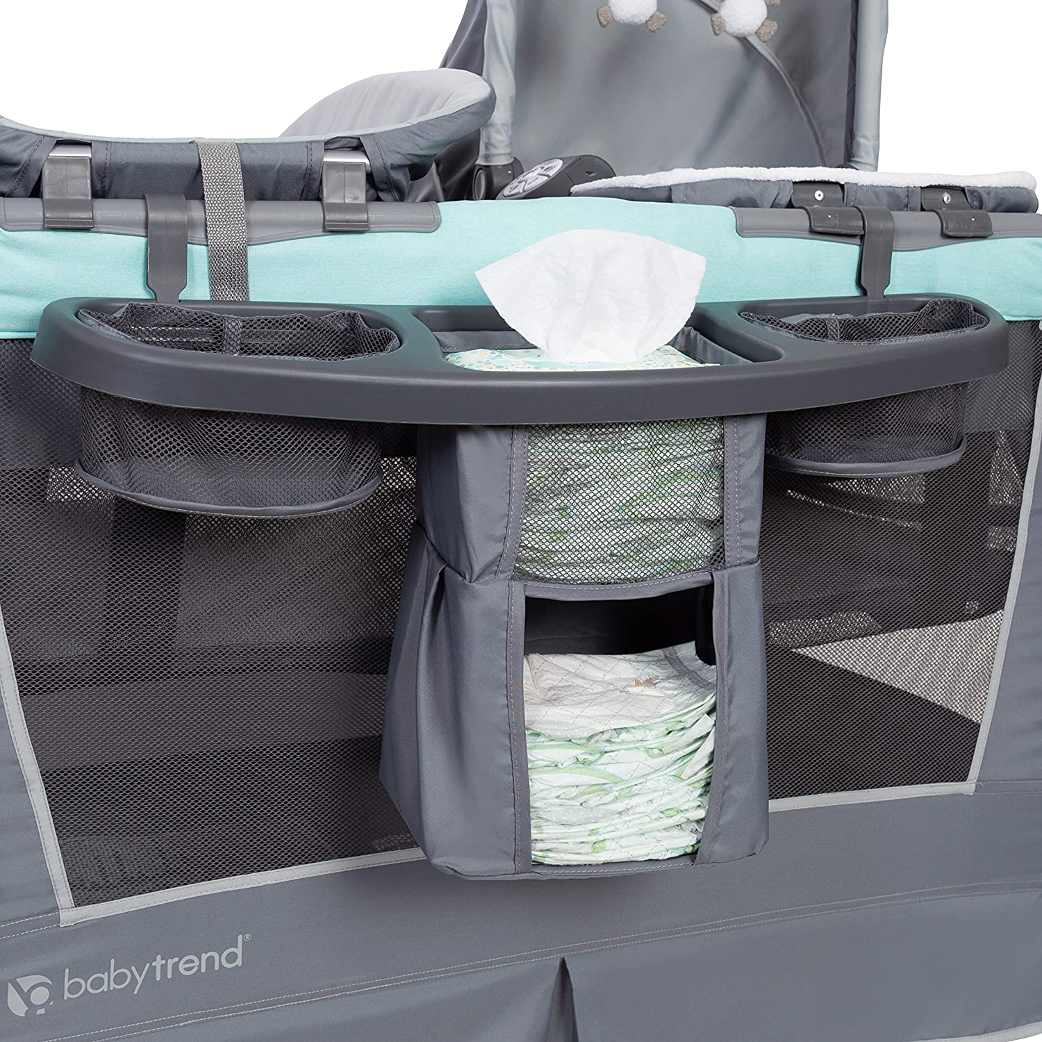 The Baby Trend Retreat Nursery Center has just about everything you need to keep your baby happy, clean, and safe. This portable playard includes a removable full bassinet, changing table, and a deluxe organizer for diapers, wipes, toys, and new outfits.
