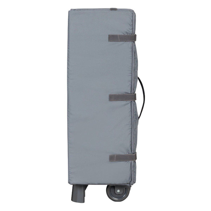 The removable Rock-a-Bye Bassinet features a canopy and handle; this deluxe bassinet can even turn into a standalone rocker to help your little one relax and sleep. The plush, fabric-lined playard has mesh sides for proper ventilation. Move the foldable playard from place to place with its large wheels, and lock the brakes in place with 1 hand. A carrying bag is included for easy transport or storage.
