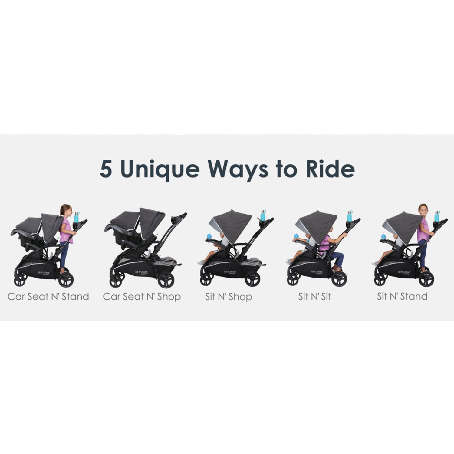- 5 ways would be Car Seat N' Stand, Car Seat N' Shop, Sit N' Shop, Sit N' Sit, and Sit N' Stand