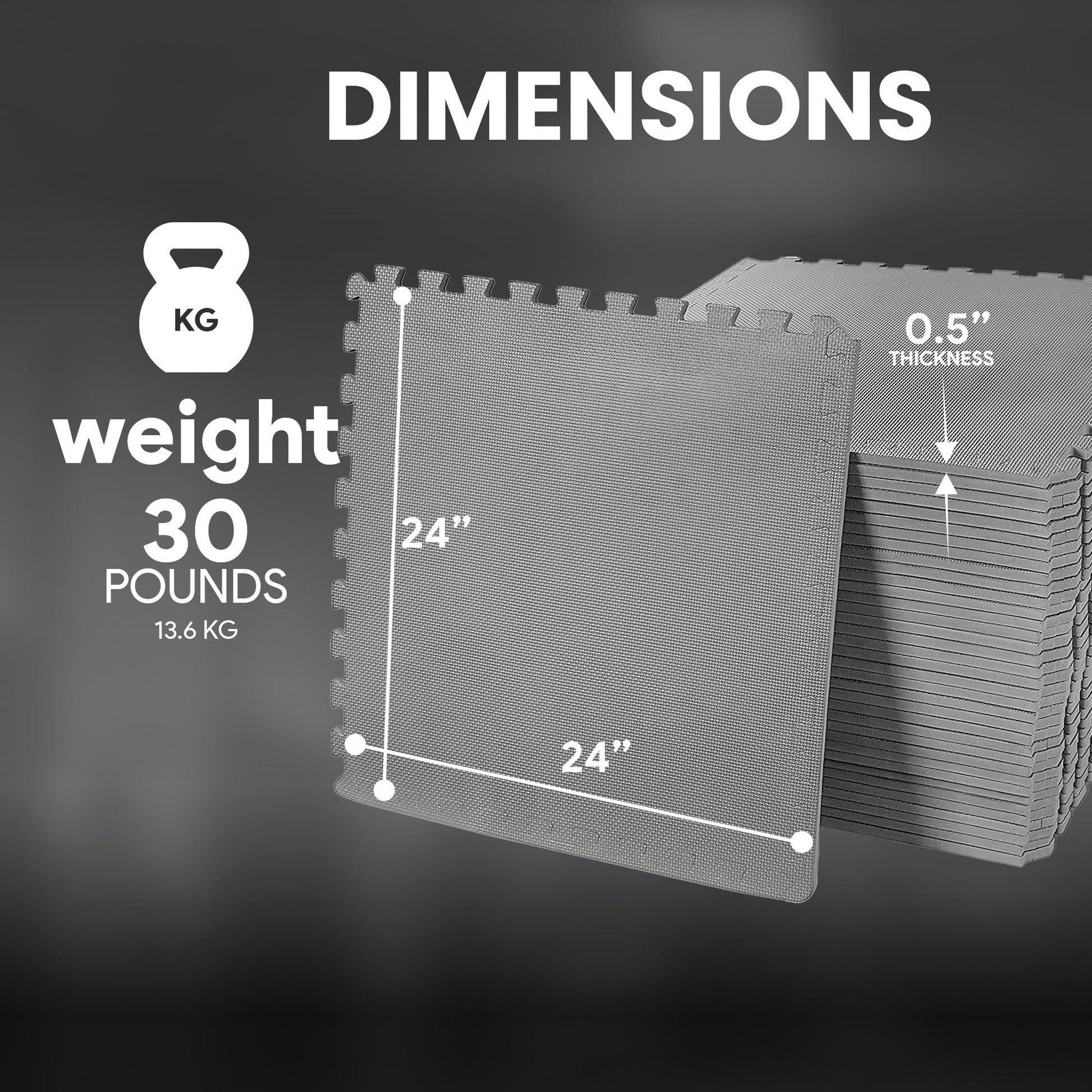 - 36 24 x 24-inch foam exercise tiles with interlocking edges and 72 end borders for 144 square feet of durable support in your home, gym, or daycare
