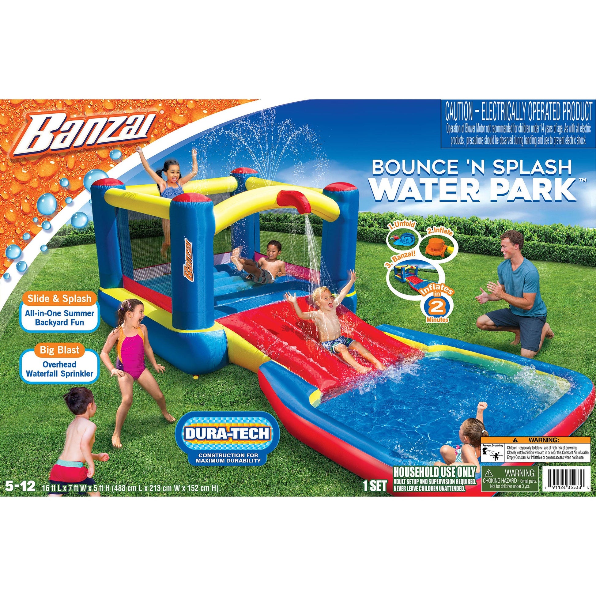 Break up the boredom of summer and challenge your friends to an adventure with the Banzai Battle Bop Combo Pack Gloves and Bumpers and Bounce 'N Splash Play Set. Enjoy endless inflatable fun all summer long with this amazing set including 2 pairs of inflatable gloves and body bumpers and a quick-setting bounce house. No need to fear; the over-cushioned, oversized gloves allow you to throw painless punches. Swing, jab, punch and go the distance for hours of fun. Find out who is the king of the hill by bouncing and bopping each other for territory. This inflatable aquatic water park combines both water-sliding fun as well as an outdoor bounce house all in one. The playset includes water sprinkles to keep the slide and bounce house slick. The included GFCI blower motor inflates the water park in under 2 minutes and by simply connecting the detachable spray hose to your garden hose, the water park will fill up in no time so the kids can have fun right away. Fill your summer with adventure and laughter using the Battle Bop Combo Pack Gloves and Bumpers and Bounce 'N Splash Play Set from Banzai.