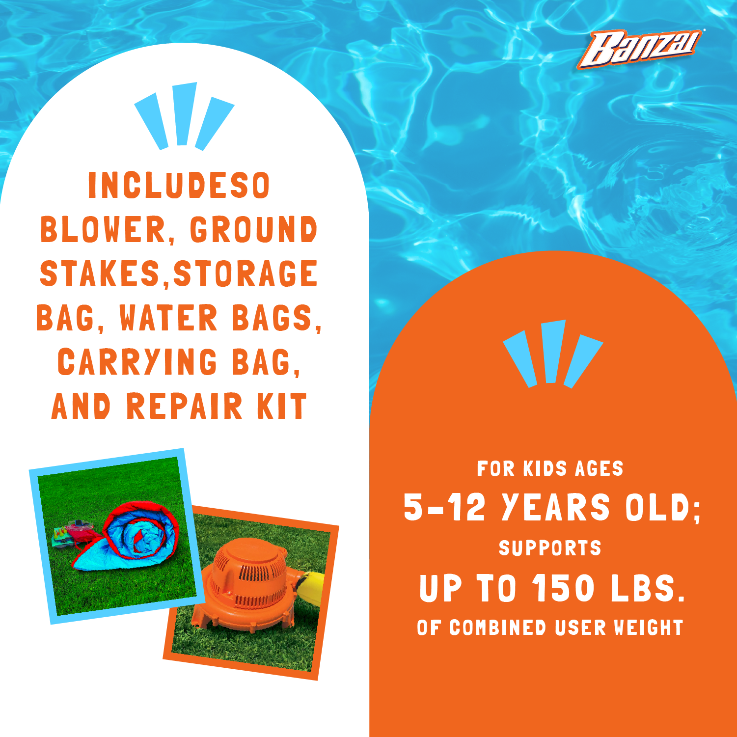 Your little ones will chill out, hang loose, and slide off into the sunset each summer with the Banzai Slide N' Soak Inflatable Splash Pool Water Park.