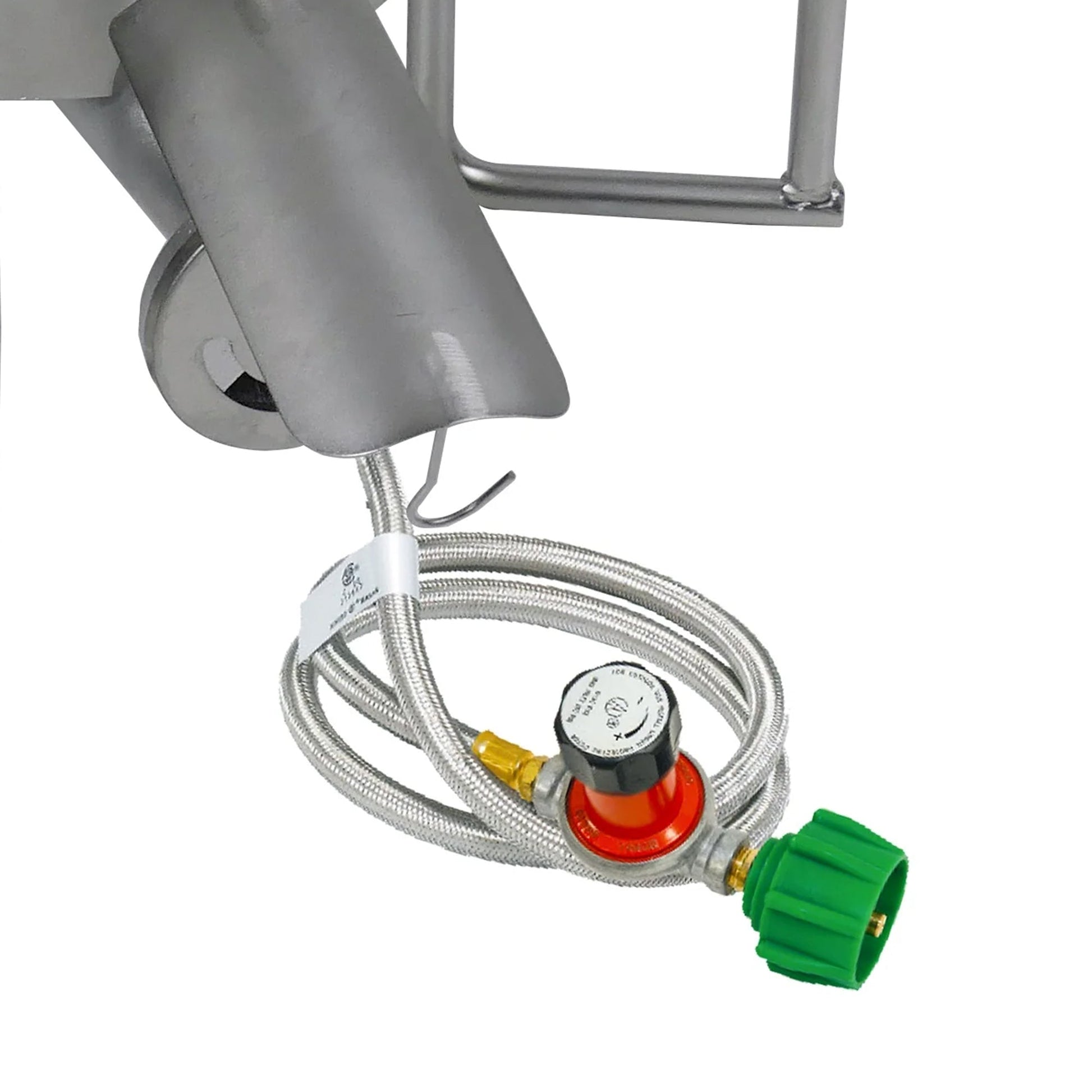 - Stainless cooker with a 10-inch cast iron burner emitting 164,000 BTUs for an impressive heat capacity for larger batches
