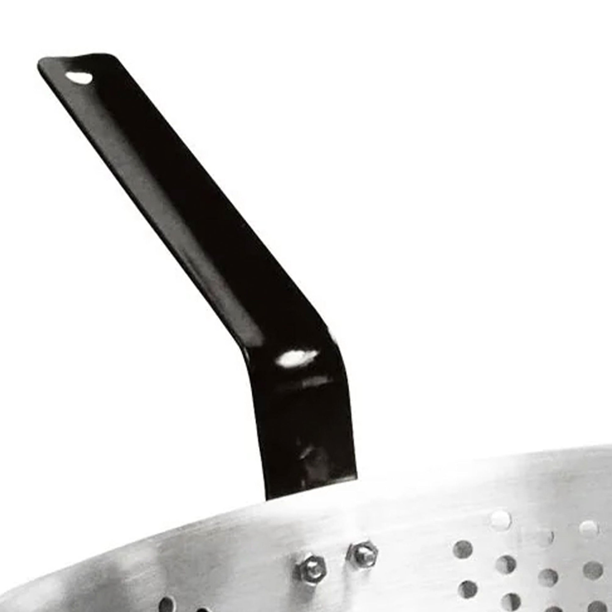 - Had heavy-duty riveted handles for secure handling of fry pot