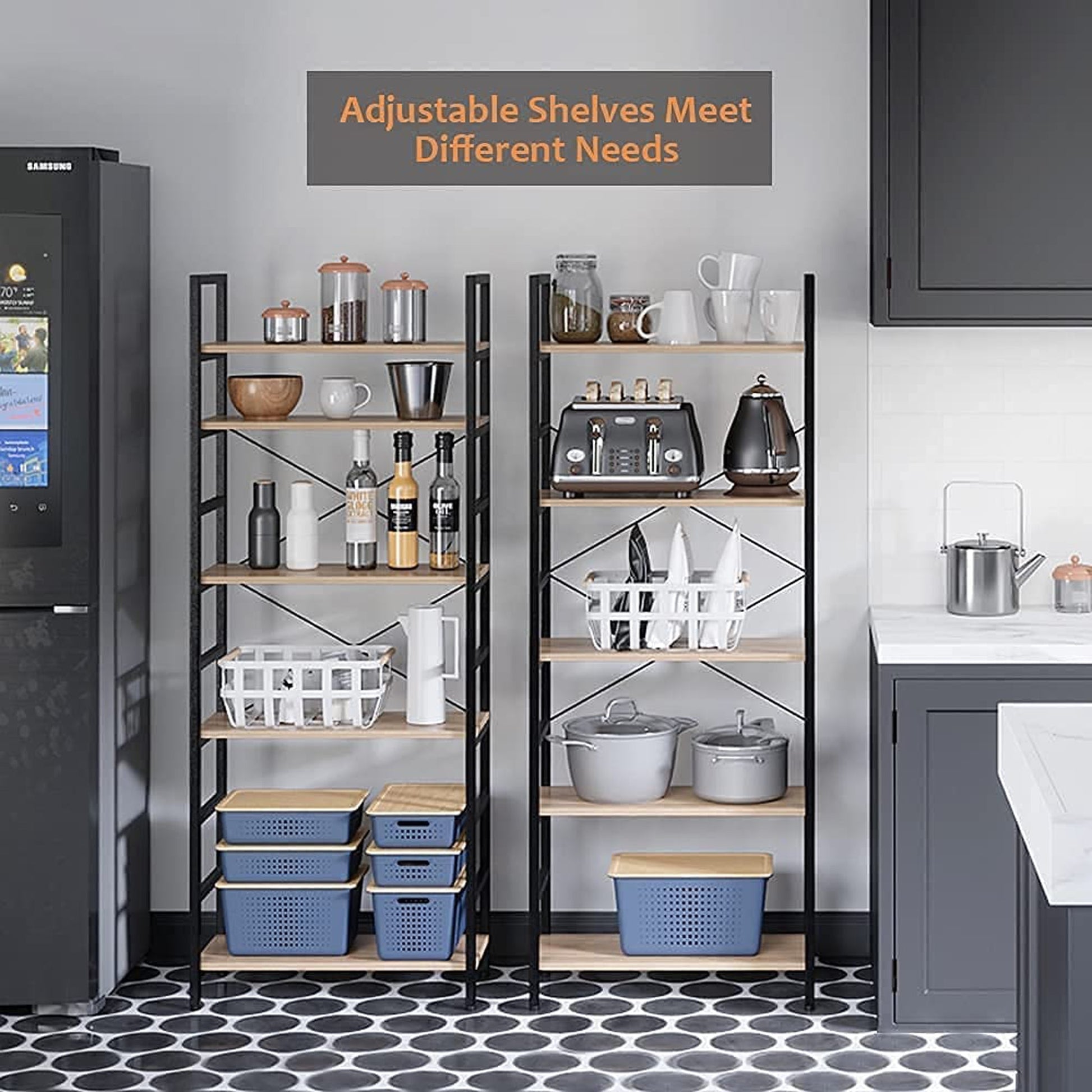 This bookshelf includes 5-level storage shelves that are adjustable with pre-punched screw holes built in the side on the shelves to suit your every need. This design is versatile to fit the needs of any room you put it in, whether it be a shelf to hold spices and cooking pans or a display shelf for your bedroom and living room.
