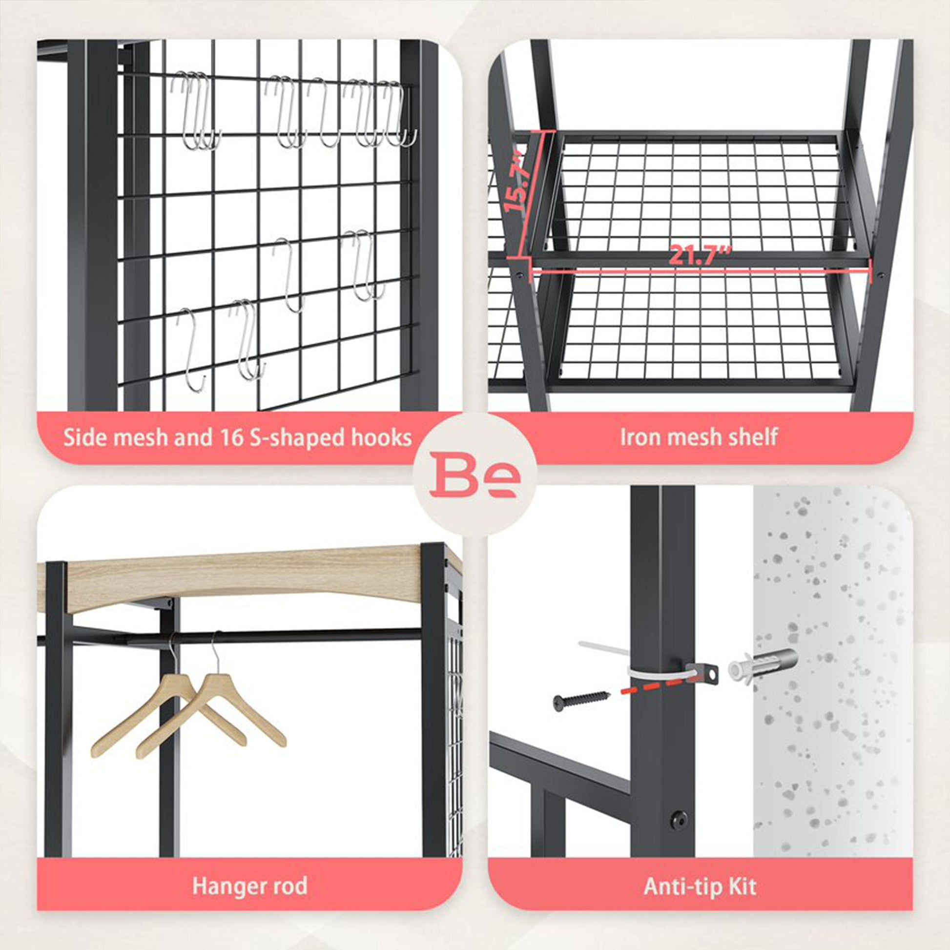 This open-space-designed freestanding wardrobe is the perfect solution for clothing storage in studio apartments, shared spaces, or rooms lacking built-in storage. Decked out with amazing premium features, you'll be able to put your favorite outfits and accessories on display and easily accessible. The 2 hanger rods are perfect for storing dresses, dress shirts, blouses, slacks, jackets, and coats, while the side grids with adjustable hooks can hold your hats, bags, scarves, and accessories.