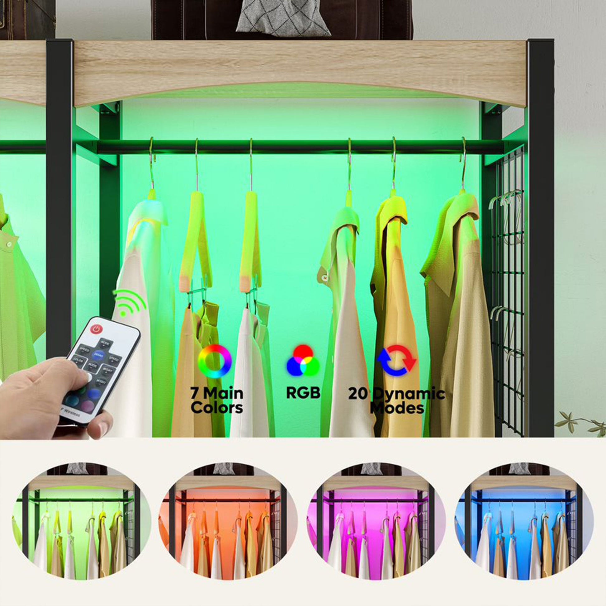 Display your shoes, bags, folded clothing, baskets, blankets, and more on the 4 iron wire shelves that hold 40 pounds each, and use the beautiful wooden shelf on top to display hat boxes, knick-knacks, artwork, and your own personal touches. For added drama and an eye-catching display, use the built-in color-changing lights to take your clothing storage to the next level. With 7 main colors and 20 dynamic modes, you can change the lighting based on your mood using the convenient remote control.