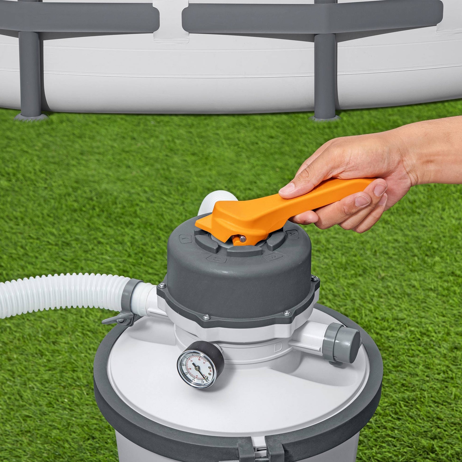 With its pre-filter strainer basket to catch large particles such as leaves and sand to capture finer materials such as hair and dirt, the Flowclear Sand Filter Pump's durable, corrosion-resistant filter tank runs smoother and longer than traditional filter cartridge pumps. Simply add your own sand (approximately 18.74 lbs; not included) or our highly-efficient, cost-effective Polysphere pool filtration spheres; quickly install the preassembled pump and adjust the 6-position valve for easy, low-maintenance filter control.