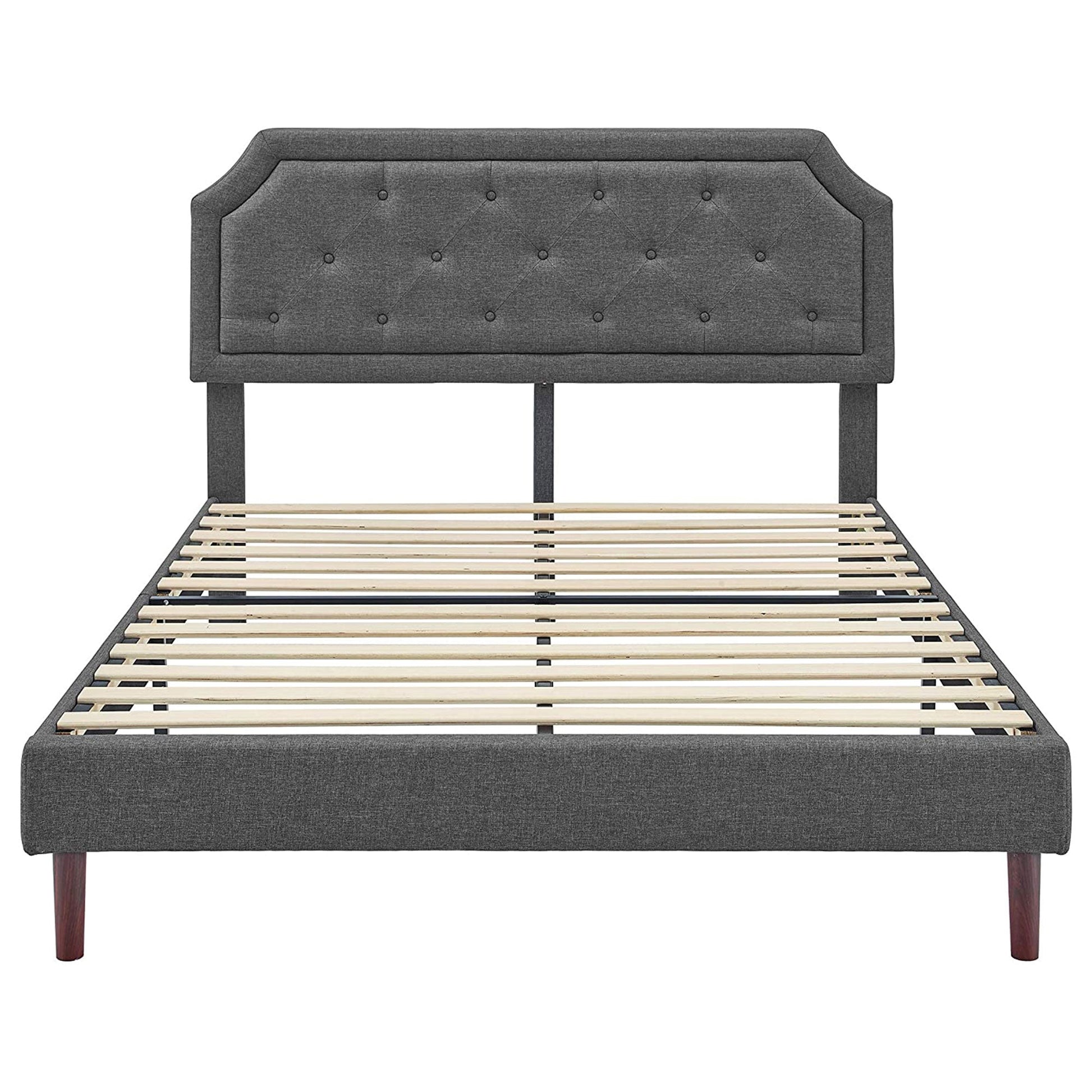This modern upholstered platform bed frame with a sleek, tufted design is a stylish addition to any bedroom. The linen-based upholstery with a curved, button-tufted headboard is sure to add a touch of modern elegance to any bedroom area. The headboard itself is adjustable from 8 to 12 inches to conform to different mattress's heights. With high-quality wooden sideboards, you can rely on a sturdy construction that'll last year after year. Durable wooden slats support up to 150 pounds each and extend your mattress's lifespan without the need for a box spring. Linen fabric is easy to clean with no-mess maintenance, and there's no need to worry about assembly with quick and simple directions for a stress-free installation.