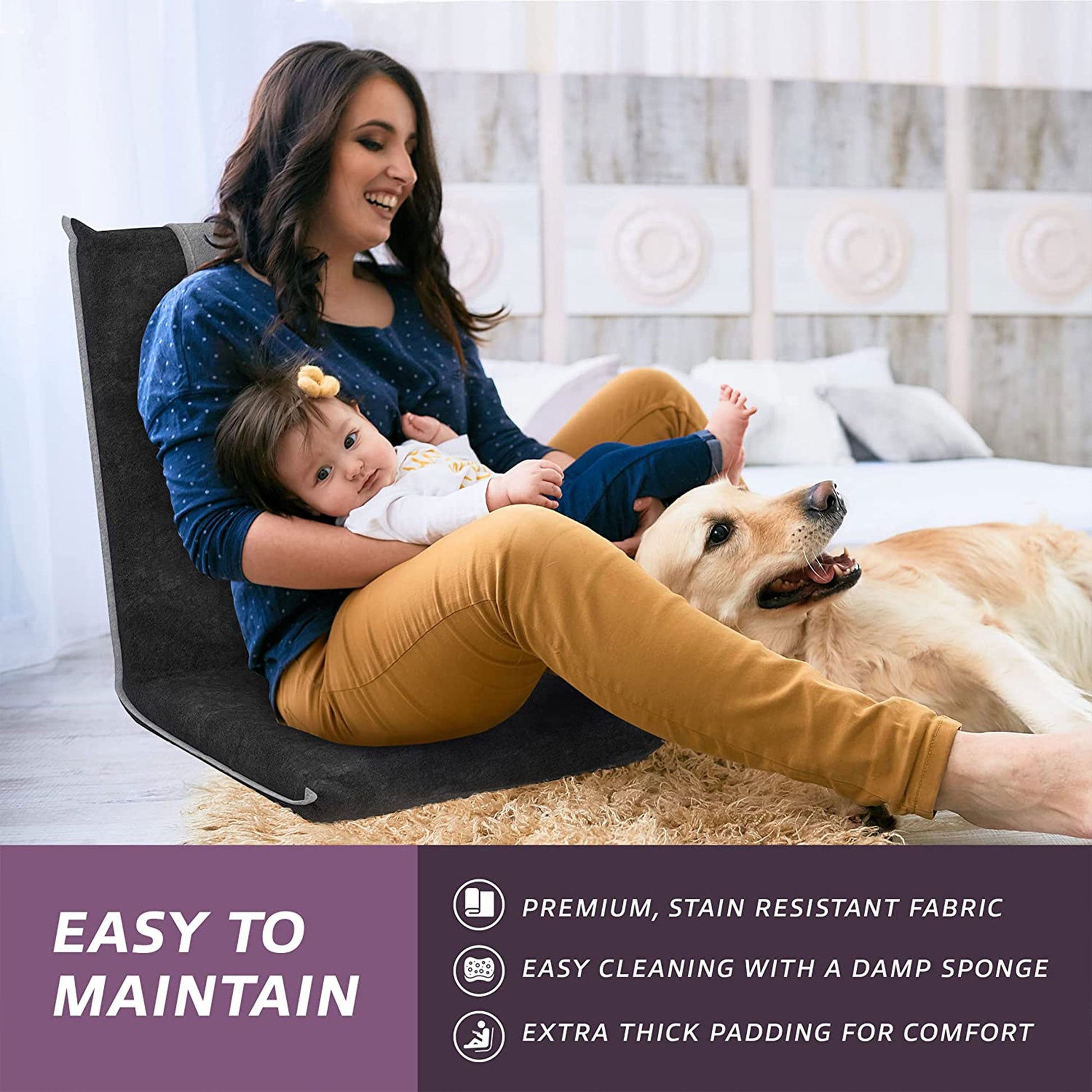 Portable and lightweight, this foldable chair can go with you anywhere! Designed with soft fabric and a cushioned seat and back, this chair with padding is great for gaming, meditating, sporting events, or just hanging out with friends at home. Adjust the backrest support to recline up to 180 degrees or position the seat back upright to promote healthy posture. Either way, you get customized comfort while you sit! For easy maintenance, the folding chair fabric resists stains and can be cleaned with a damp sponge. The unique, modern color scheme coordinates with almost any decor and provides a touch of flair to your home. This portable seat measures 16.9 inches wide and 21.3 inches tall with a seat depth of 7.4 inches, suitable for both adults and children.