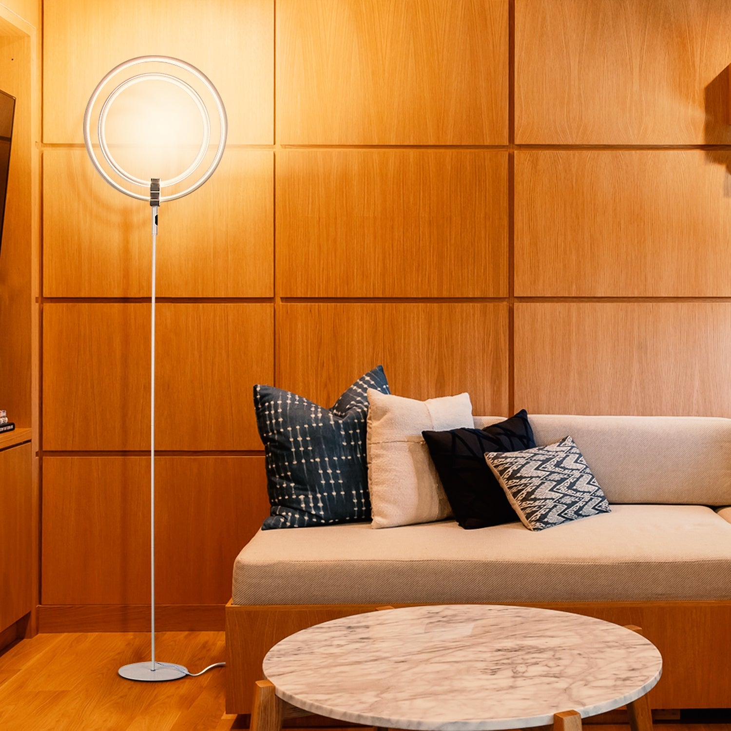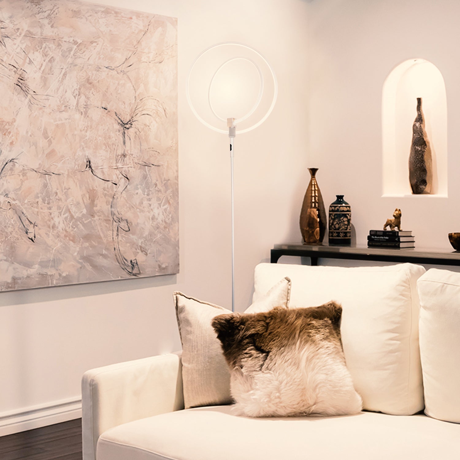 This shadeless floor lamp is supported by a tough metal frame with a heavy base to prevent tip-over. A matte white finish emphasizes the sleek, simple lines and adds to the minimalist modern allure. The dual rings each house a bright white LED bulb that are extra bright and energy efficient. Each ring can be turned and angled independently of one another, perfect for reading or whole-room illumination. Dim the lights with the convenient touch switch.