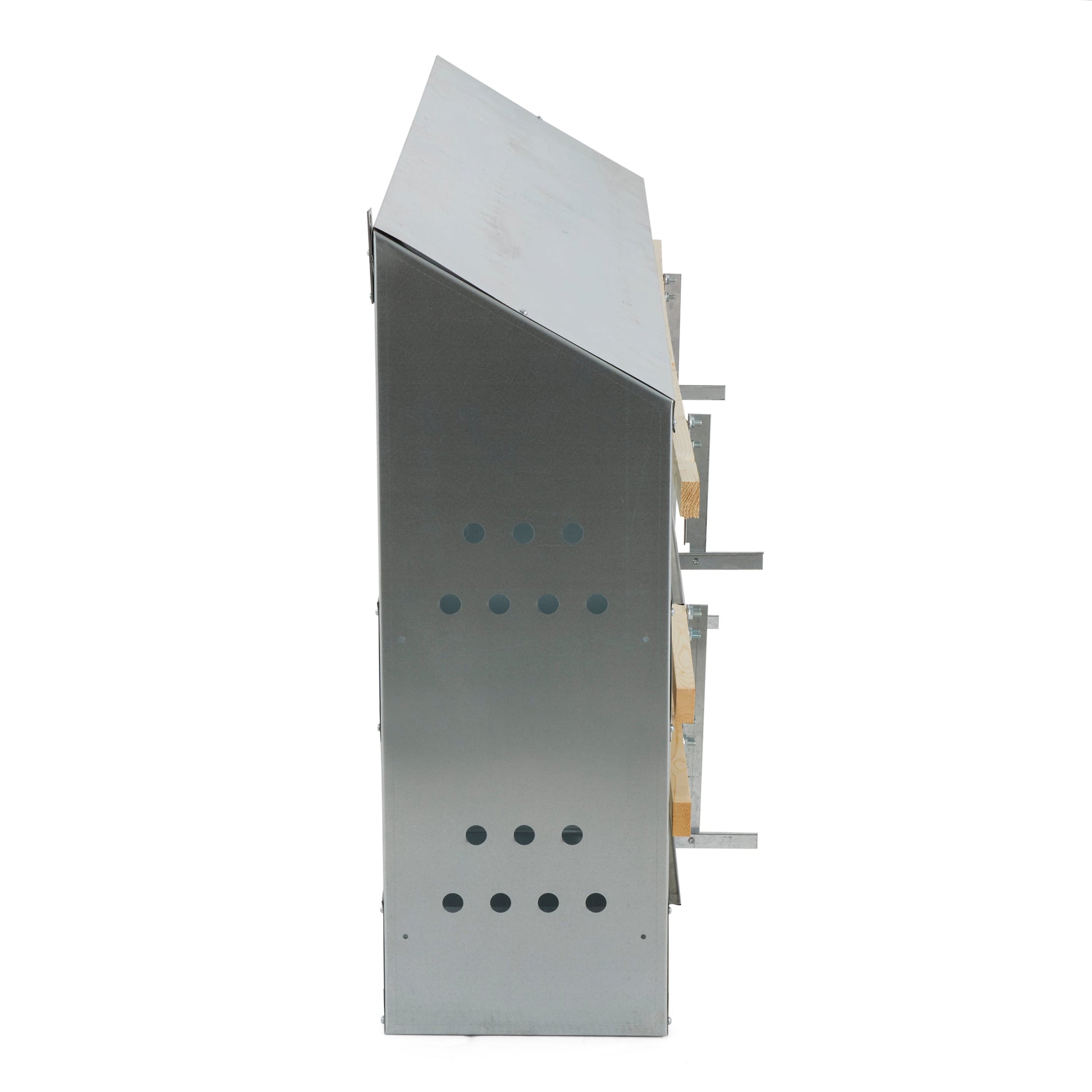 This pack of 4 poultry laying boxes is made from durable galvanized steel with folded edges for safety and a slanted roof to help keep your cluckers safe from the elements. The 10 bays provide room for up to 60 brooding hens and feature side ventilation holes for airflow. Stagger the nests back-to-back to prevent the hens from having full mobility if necessary. The outdoor hen house features double-bolted perches with hinged that allow them to be folded back easily as desired. Assembly and installation are made quick and easy with the included instructions. Setup takes under an hour and only requires a screwdriver and wrench; no rivet gun is necessary.