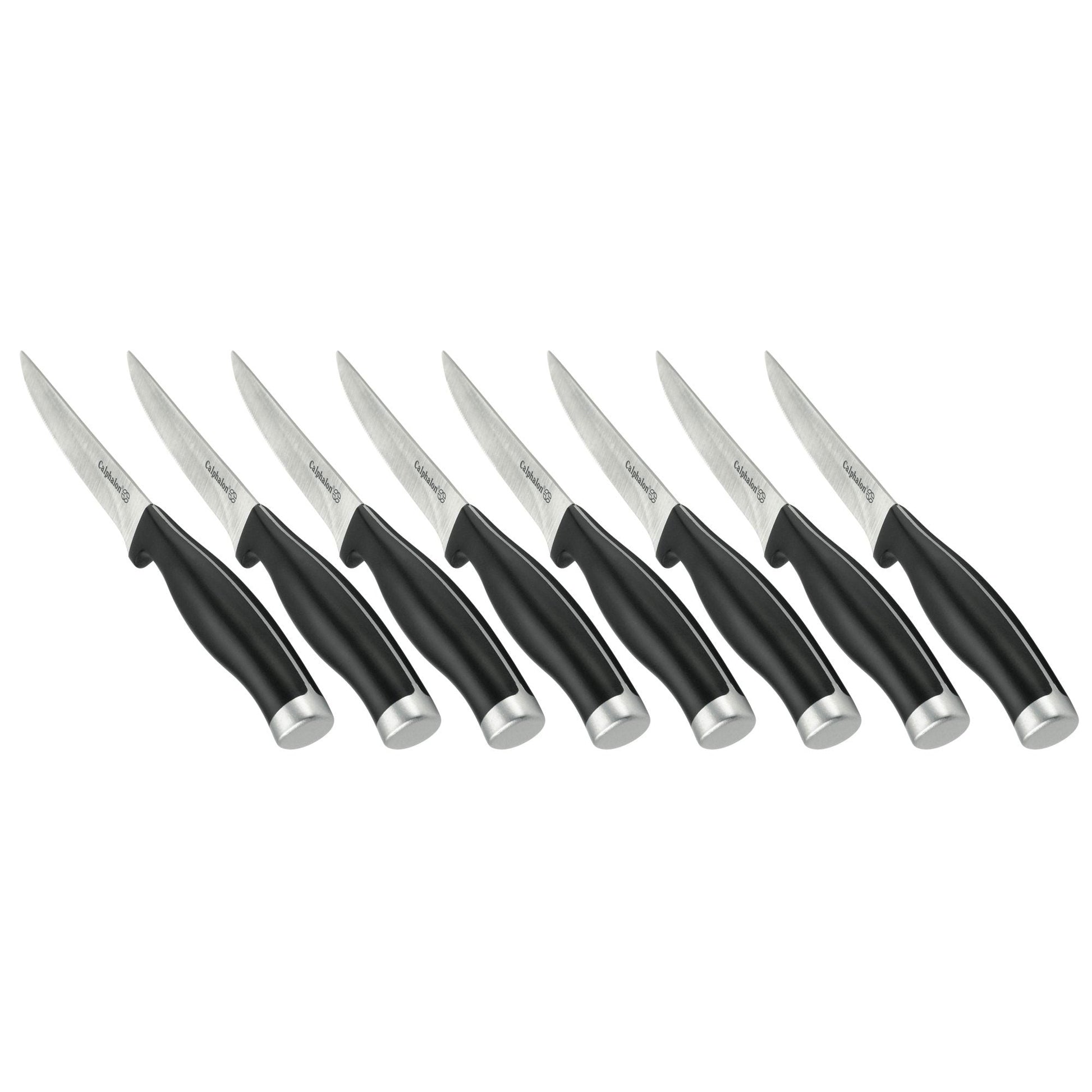 Contoured handles are labeled on the end so you can pull the correct knife out of the block every time. This high-quality knife set helps with the needless cost of buying knives separately and helps keeps all the knives organized, matching, and sharp. Sharpen up your cooking skills with the durable and sharp cutlery knife set to your kitchen.