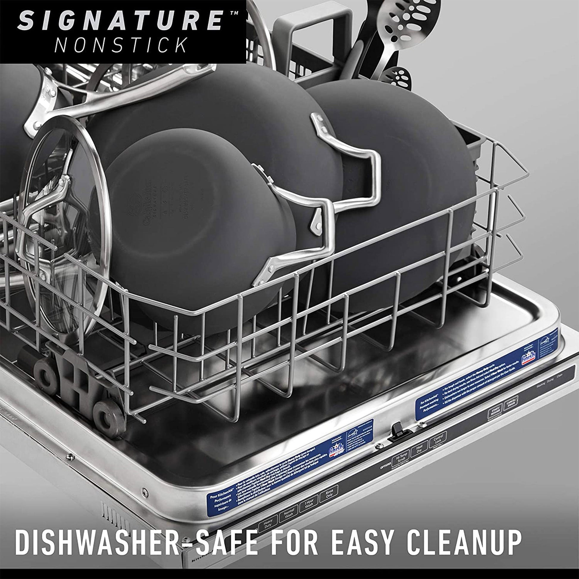 - Hard-anodized aluminum provides even heat distribution that'll cook your food better and improve the taste
