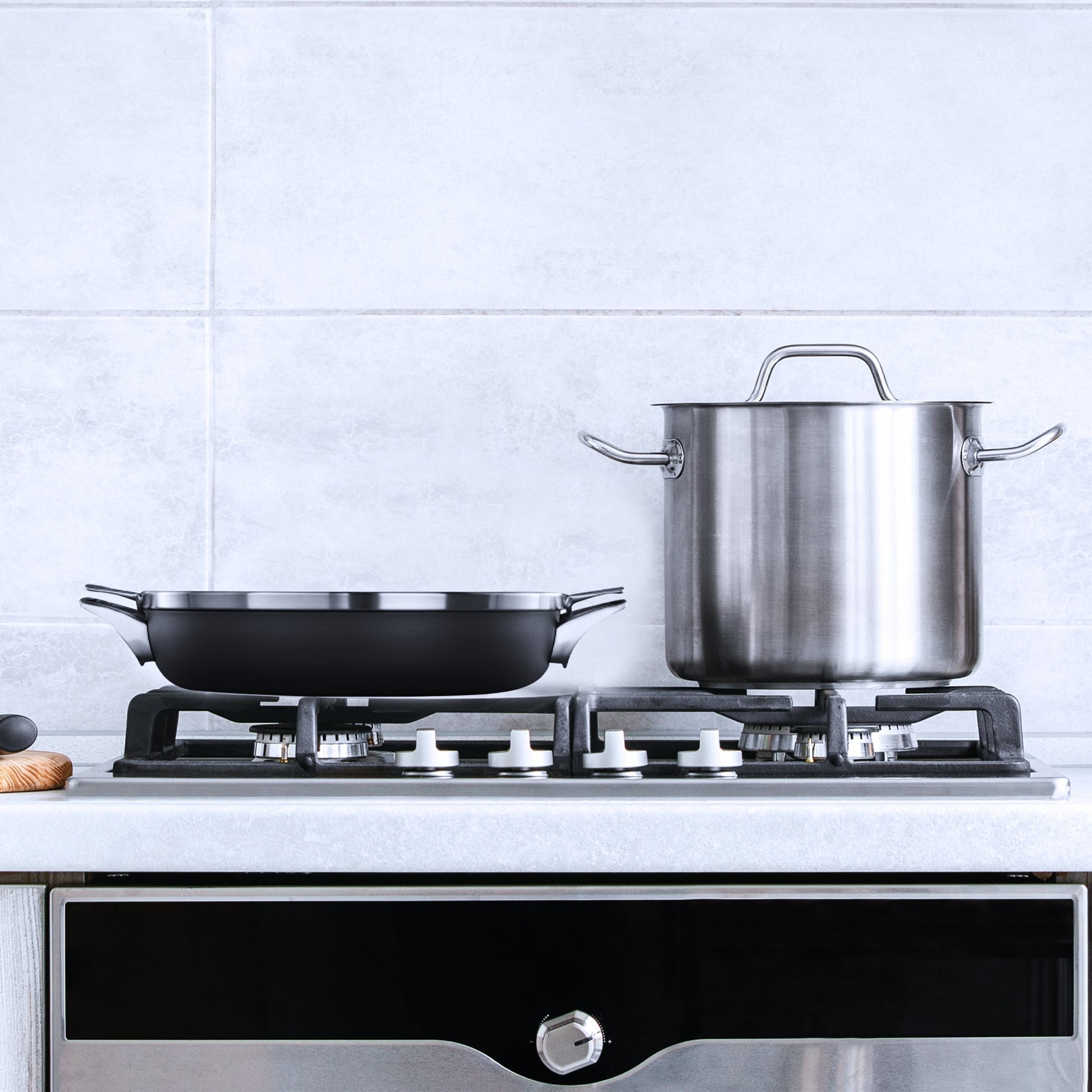 This nonstick everyday pan with a lid provides long-lasting performance and easy food release, allowing you to cook with confidence and serve even the most delicate foods with ease. This space-saving design is stackable, saving 30-percent more space than its non-stacking counterparts. The pan nests in any order when stored on other items of the same diameter due to the unique design and flat glass covers. To withstand metal utensils and everyday use, a 3-layer nonstick interior is made with some of the hardest minerals, and the hard-anodized exterior is dishwasher-safe for easy cleanup. Oven-safe up to 450 degrees Fahrenheit, the cookware is able to go from the stovetop into the oven for heating and cooking versatility.