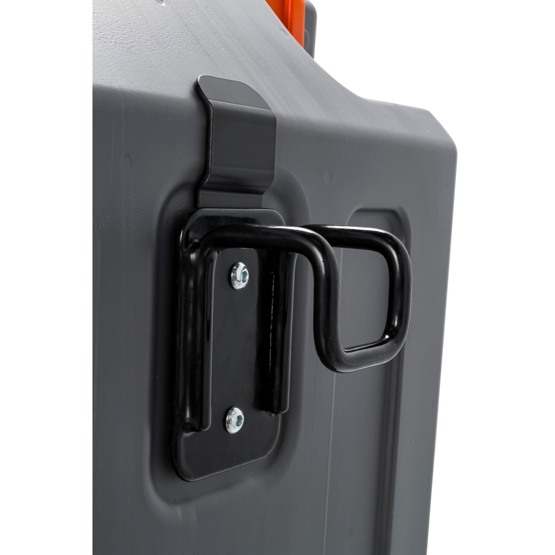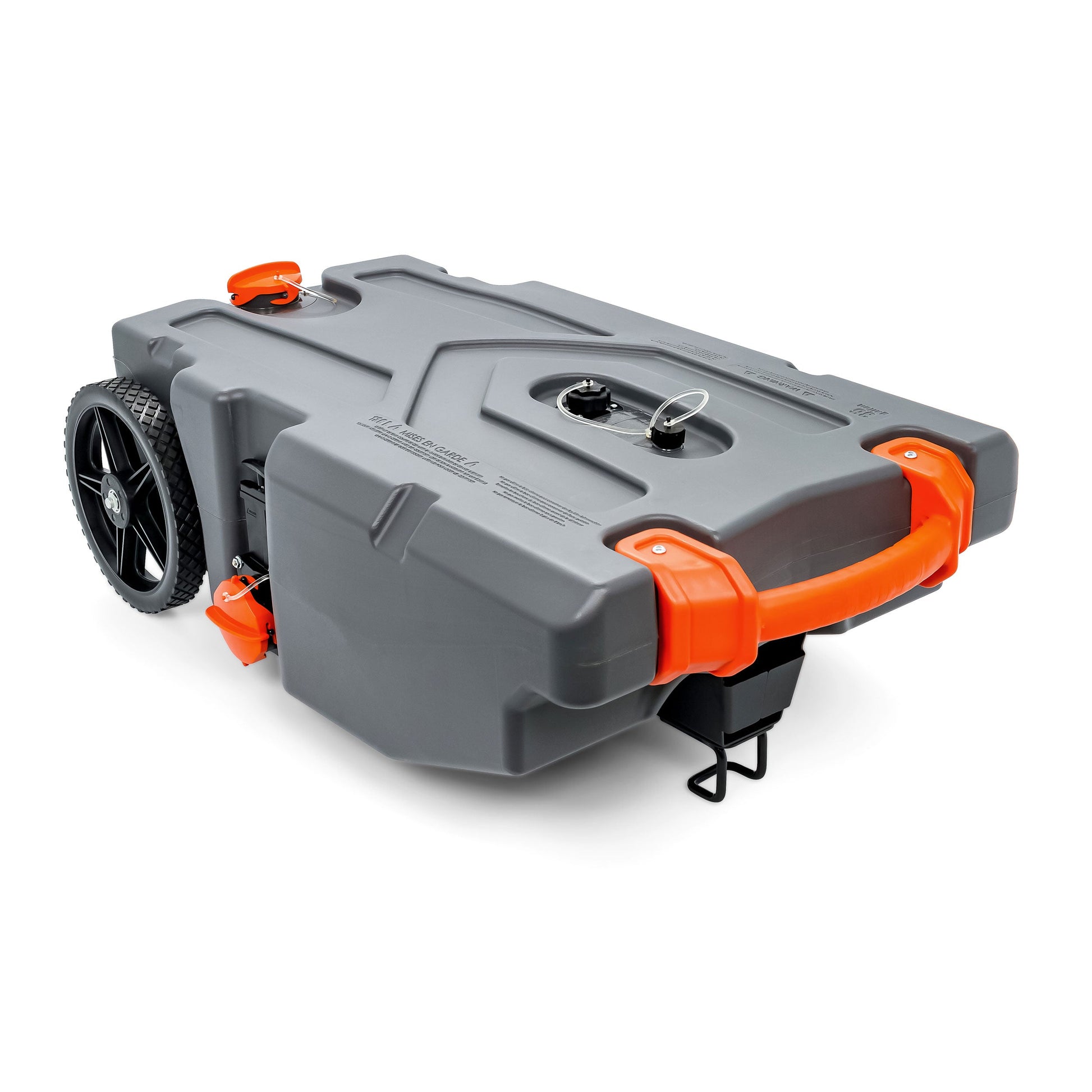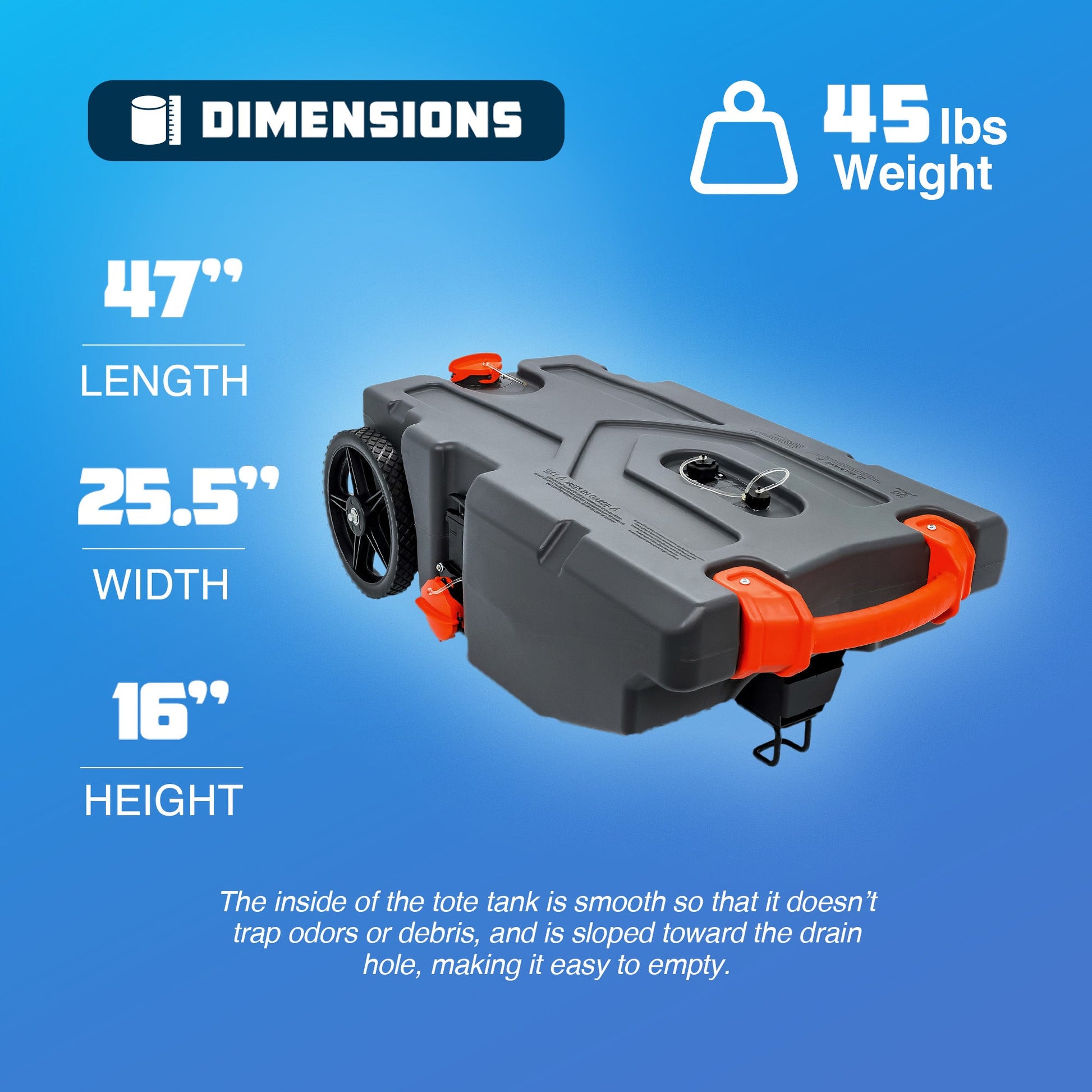 It's crafted from durable blow-molded, UV-stabilized HDPE that ensures it won't leak or deteriorate in the sun. Zinc-plated hardware prevents rust and corrosion. The interior is smooth, preventing odors and debris buildup, and it's sloped for easy emptying. The oversized and robust handle allows worry-free towing or pulling, and the integrated ladder hook at the bottom lets you hang the tank on your RV's ladder when empty.