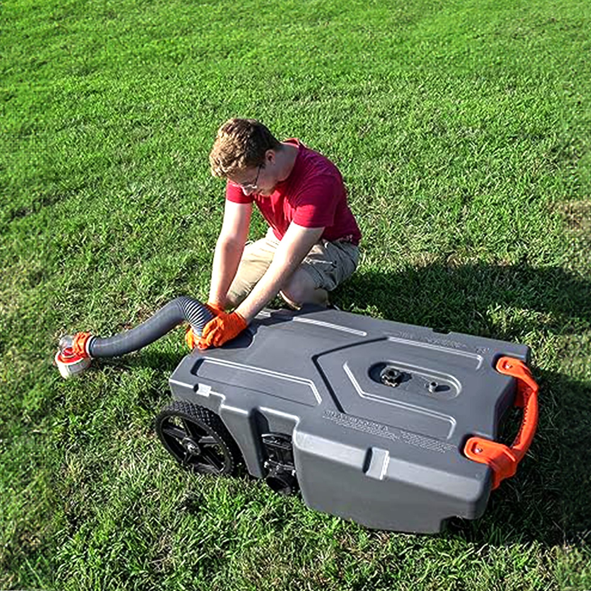 - This portable holding tank has everything needed to transport waste from your RV to dump station