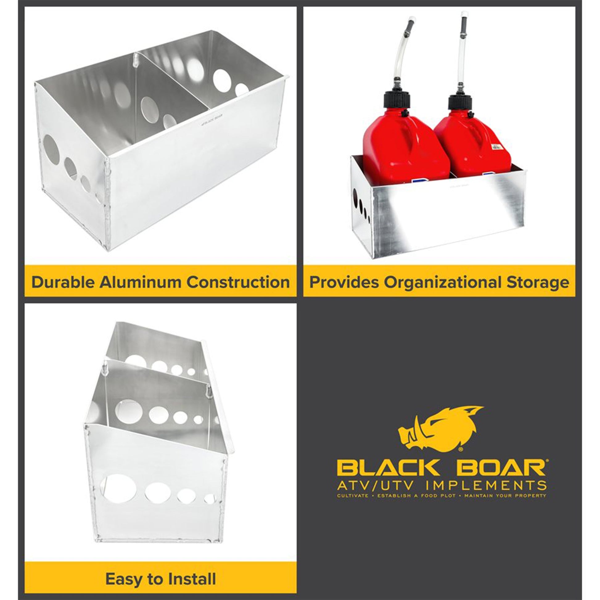 Transform your enclosed trailer into a practical and efficient storage solution with the Camco Black Boar Double Fuel Jug Storage Container.