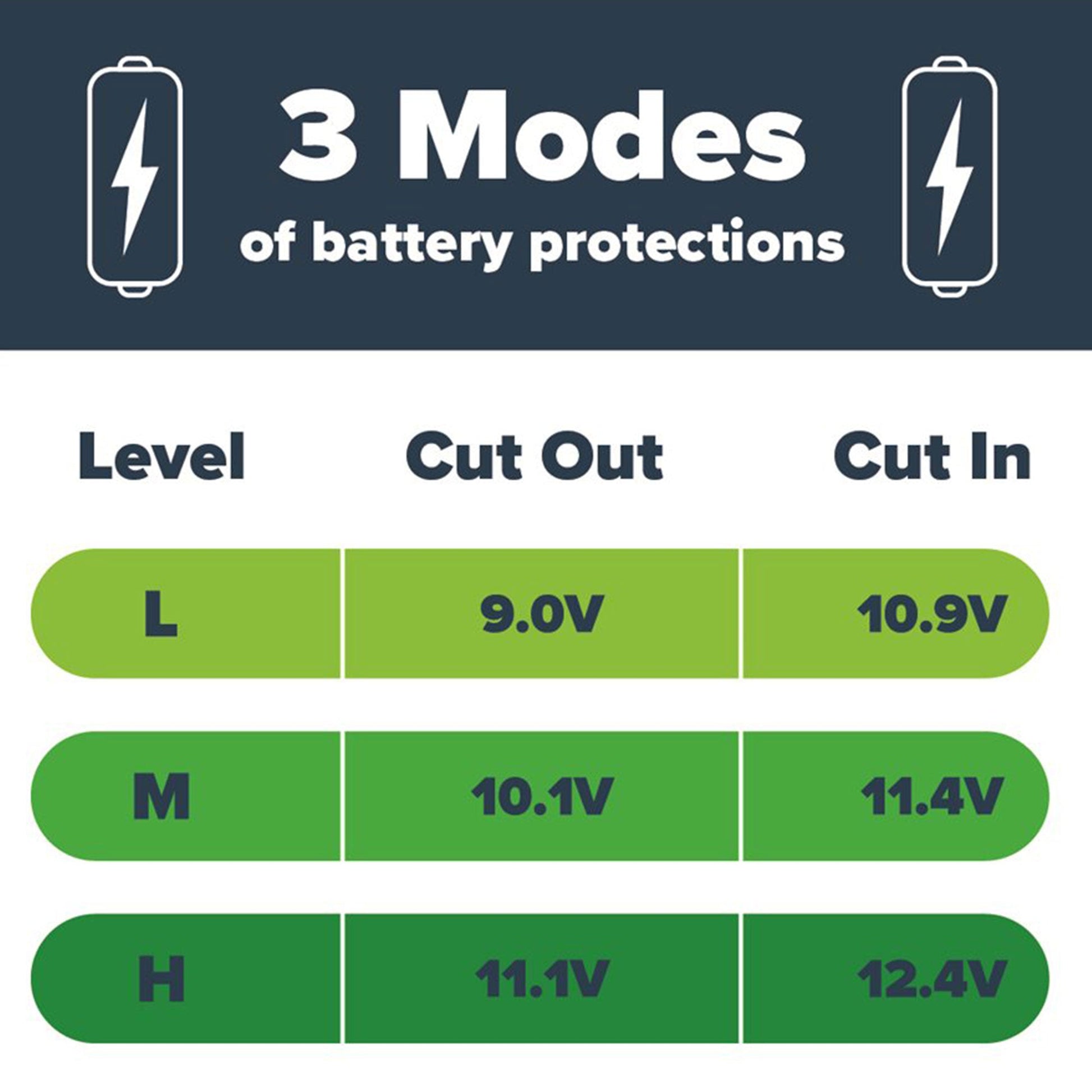 - 3-mode low voltage protection for 12V DC outlets prevent dead car batteries or enables a deep draw on dual batteries