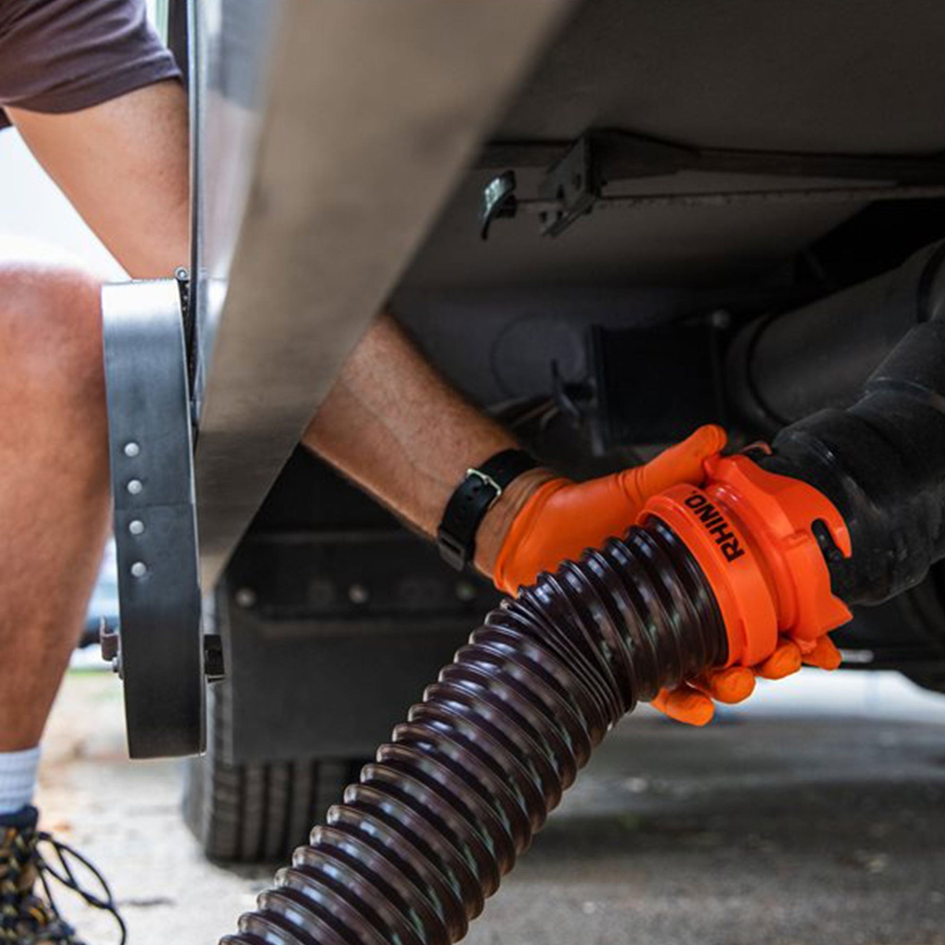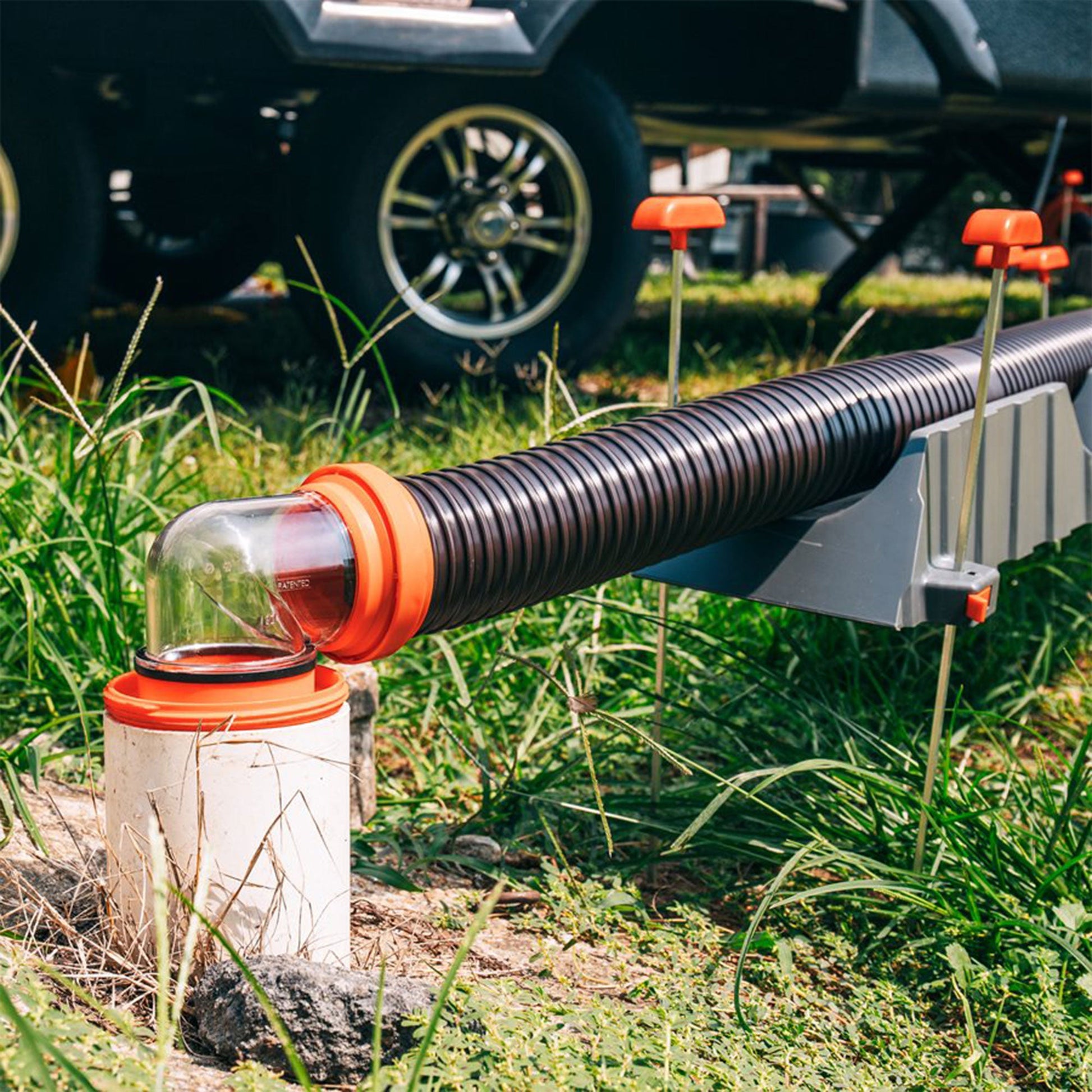 Constructed from robust polyolefin and reinforced with steel wire, the kit includes two collapsible RhinoFLEX sewer hoses designed for resilience and flexibility. The hoses feature bayonet fittings with 4 prongs, providing a secure fit that is permanently attached to prevent leaks. The kit also comes with a transparent elbow equipped with a detachable 4-in-1 adapter for effortless connection to various sewer connections. Conveniently, storage caps for each hose end are included. The versatile design accommodates different dump-station pipes, and the swivel fittings make setup easy. Each 10-foot section compresses to 39 inches for compact storage, facilitated by the removable 4-in-1 adapter that fits within standard 4-inch square bumpers. Constructed with 23 mils of sturdy polyolefin reinforced with steel wire, ensuring a reliable and leak-free experience with permanent fittings.