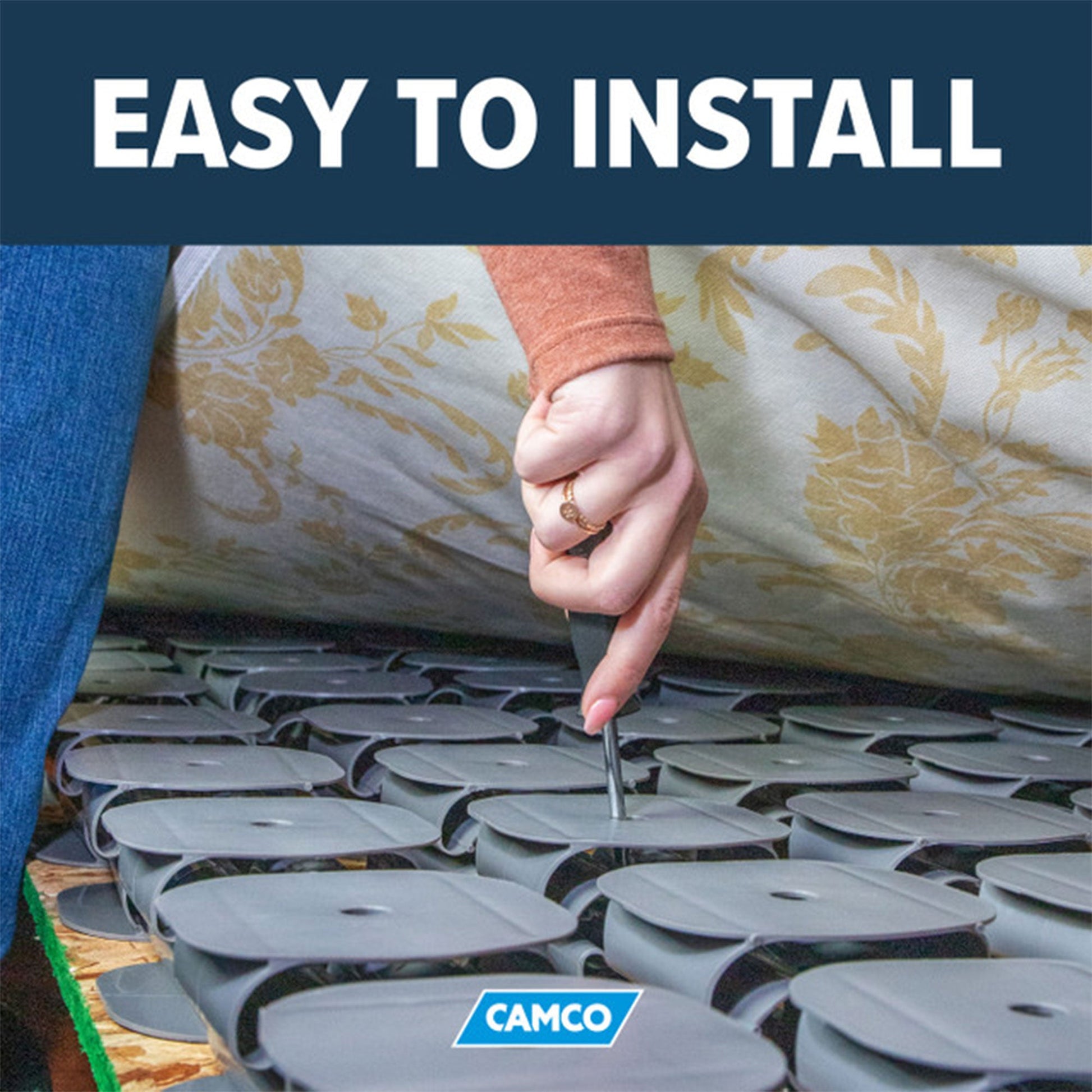 Constructed from a durable polymer, these bed springs are built to withstand the rigors of RV and marine environments. The robust materials ensure that the springs maintain their shape and functionality over time, providing consistent support and comfort. Enjoy the peace of mind that comes with a well-supported mattress, and wake up refreshed and ready for your next adventure. The Bed Spring Kit from Camco not only improves your sleeping experience but also adds value to your RV or boat by enhancing the overall quality of your sleeping arrangements.