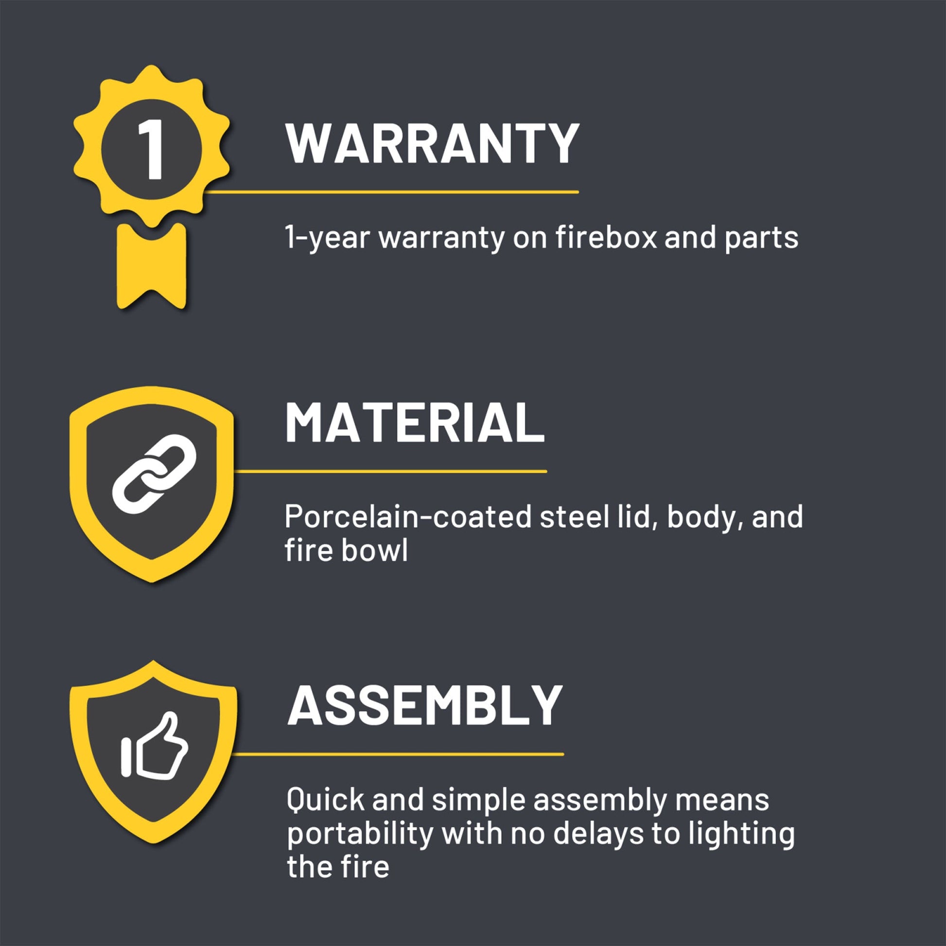 - Smoker features attractive porcelain-coated steel lid, body, and fire bowl, ensuring long-lasting durability and protection against outdoor elements